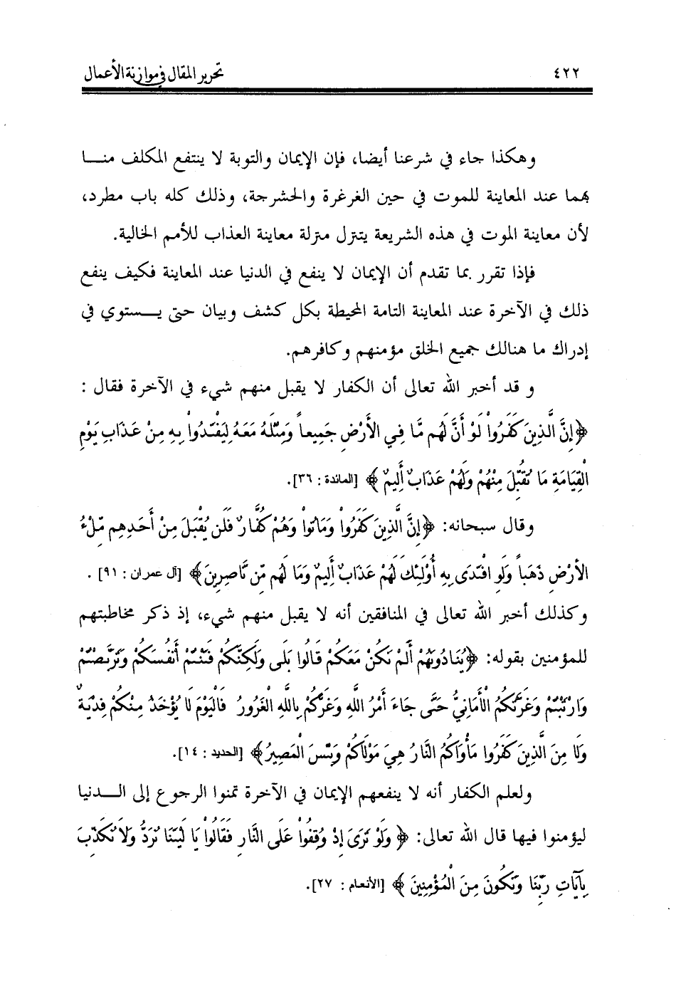 فإذا تقرر بما تقدم أن الإيمان لا ينفع في الدنيا عند المعاينة فكيف ينفع ذلك في الآخرة عند المعاينة التامة المحيطة بكل كشف وبيان حتى يستوي في إدراك ما هنالك جميع الخلق مؤمنهم وكافرهم.