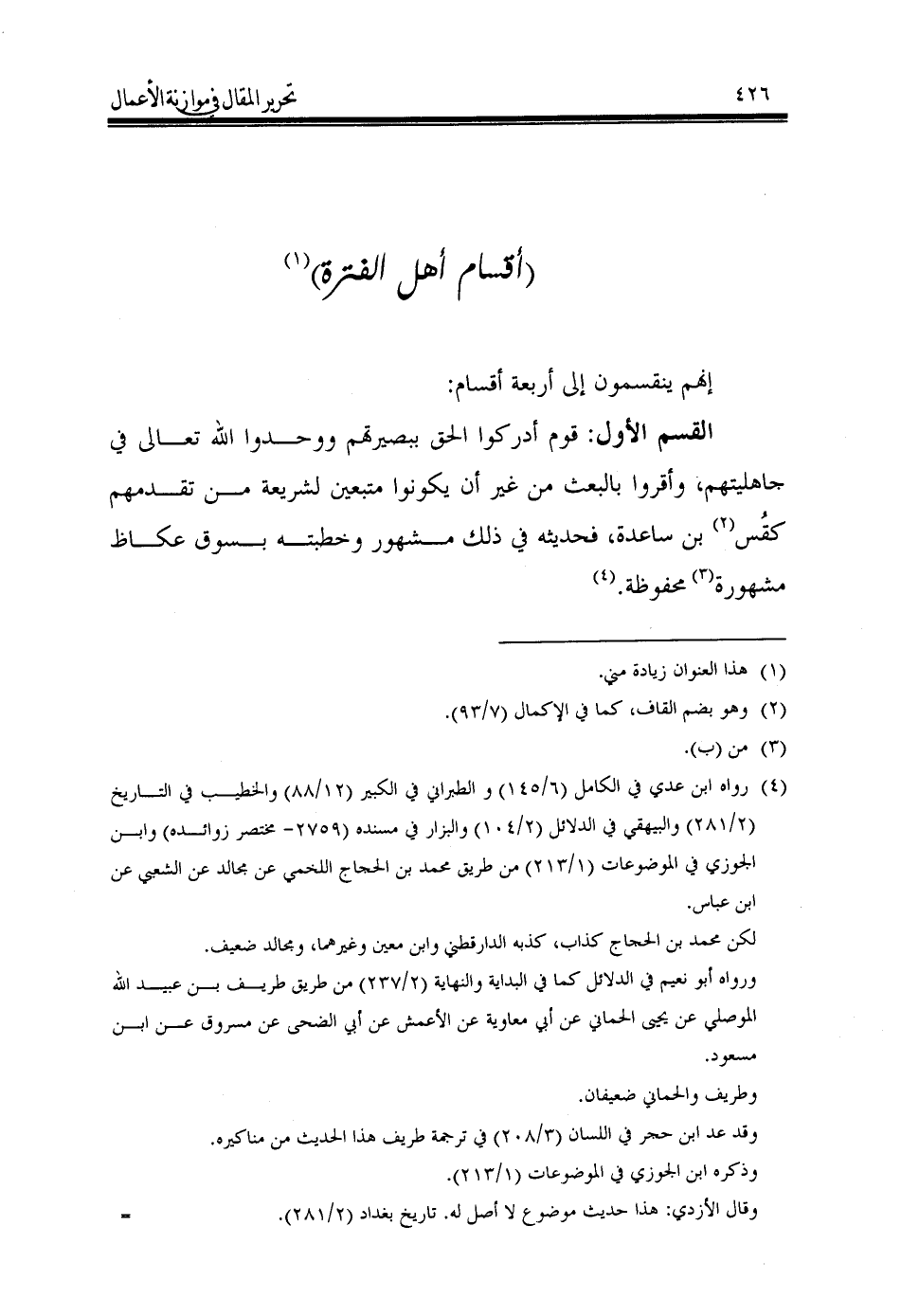 القسم الأول: قوم أدركوا الحق ببصيرتهم ووحدوا الله تعالى في جاهليتهم، وأقروا بالبعث من غير أن يكونوا متبعين لشريعة من تقدمهم كقُس (¬2) بن ساعدة، فحديثه في ذلك مشهور وخطبته بسوق عكاظ مشهورة (¬3) محفوظة. (¬4)