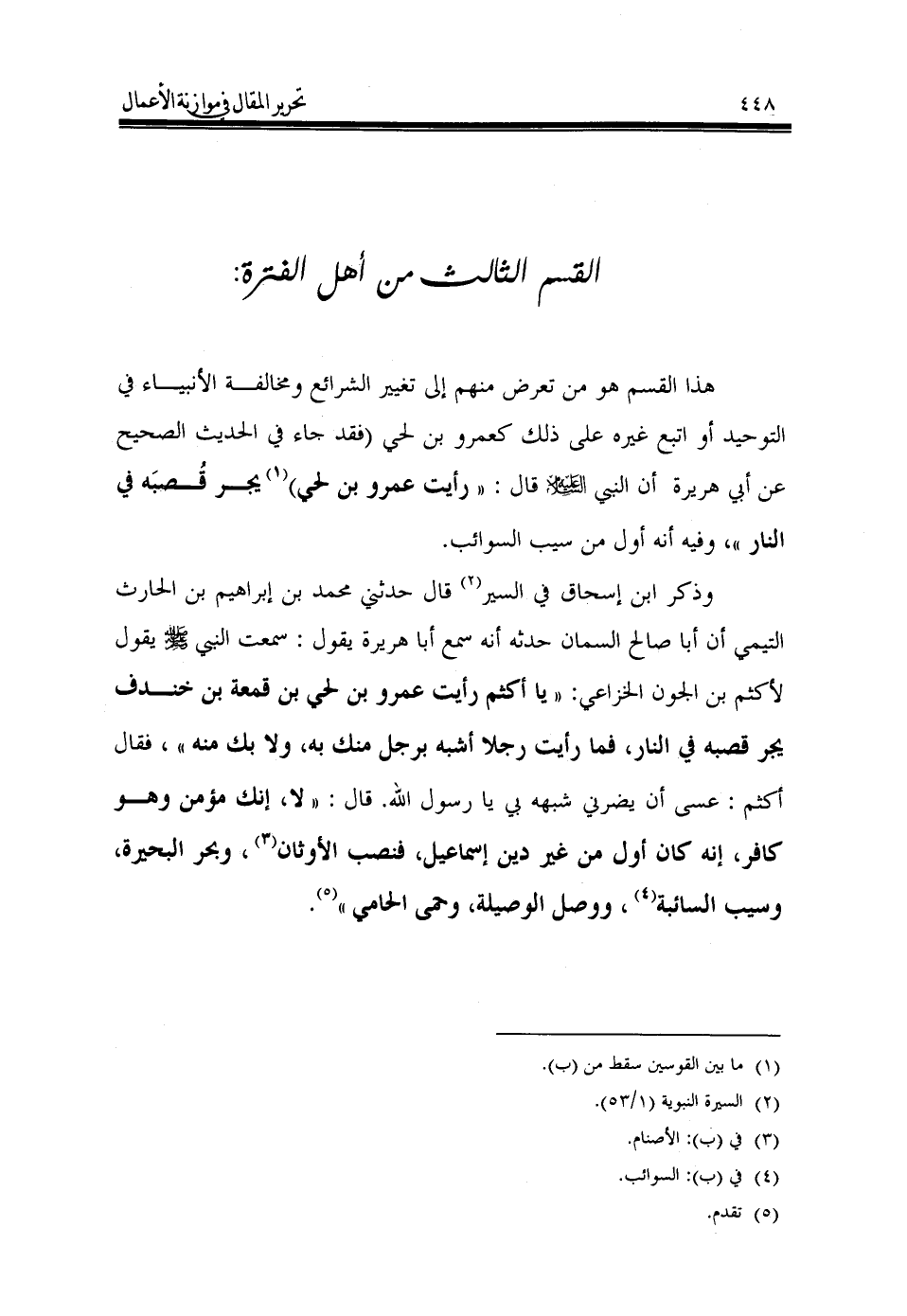 هذا القسم هو من تعرض منهم إلى تغيير الشرائع ومخالفة الأنبياء في التوحيد أو اتبع غيره على ذلك كعمرو بن لحي (فقد جاء في الحديث الصحيح عن أبي هريرة أن النبي - عليه السلام - قال: «رأيت عمرو بن لحي) (¬1) يجر قُصبَه في النار»، وفيه أنه أول من سيب السوائب.
