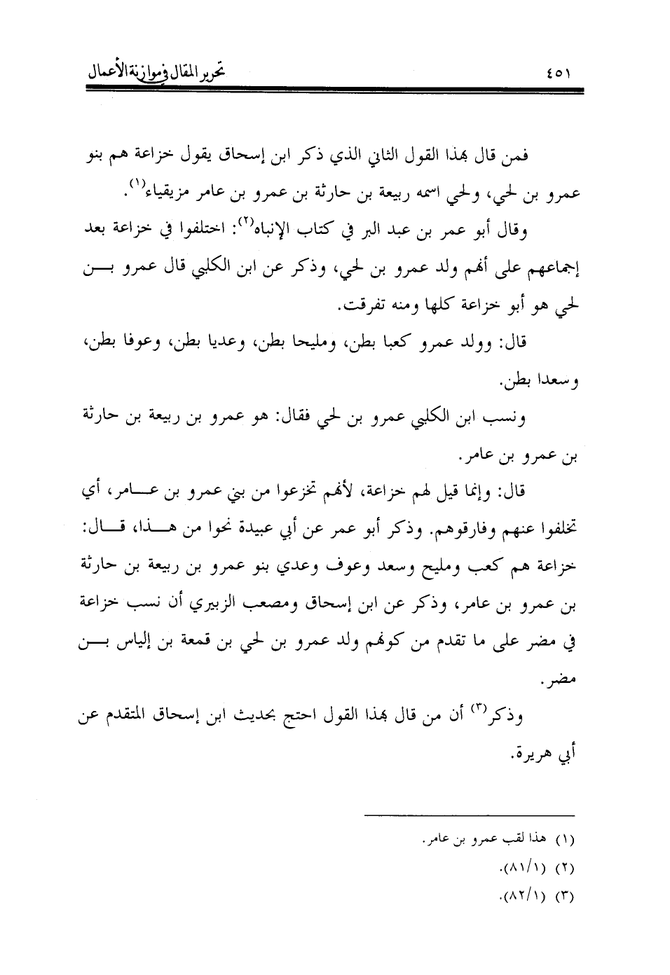 وقال أبو عمر بن عبد البر في كتاب الإنباه (¬2): اختلفوا في خزاعة بعد إجماعهم على أنهم ولد عمرو بن لحي، وذكر عن ابن الكلبي قال عمرو بن لحي هو أبو خزاعة كلها ومنه تفرقت.