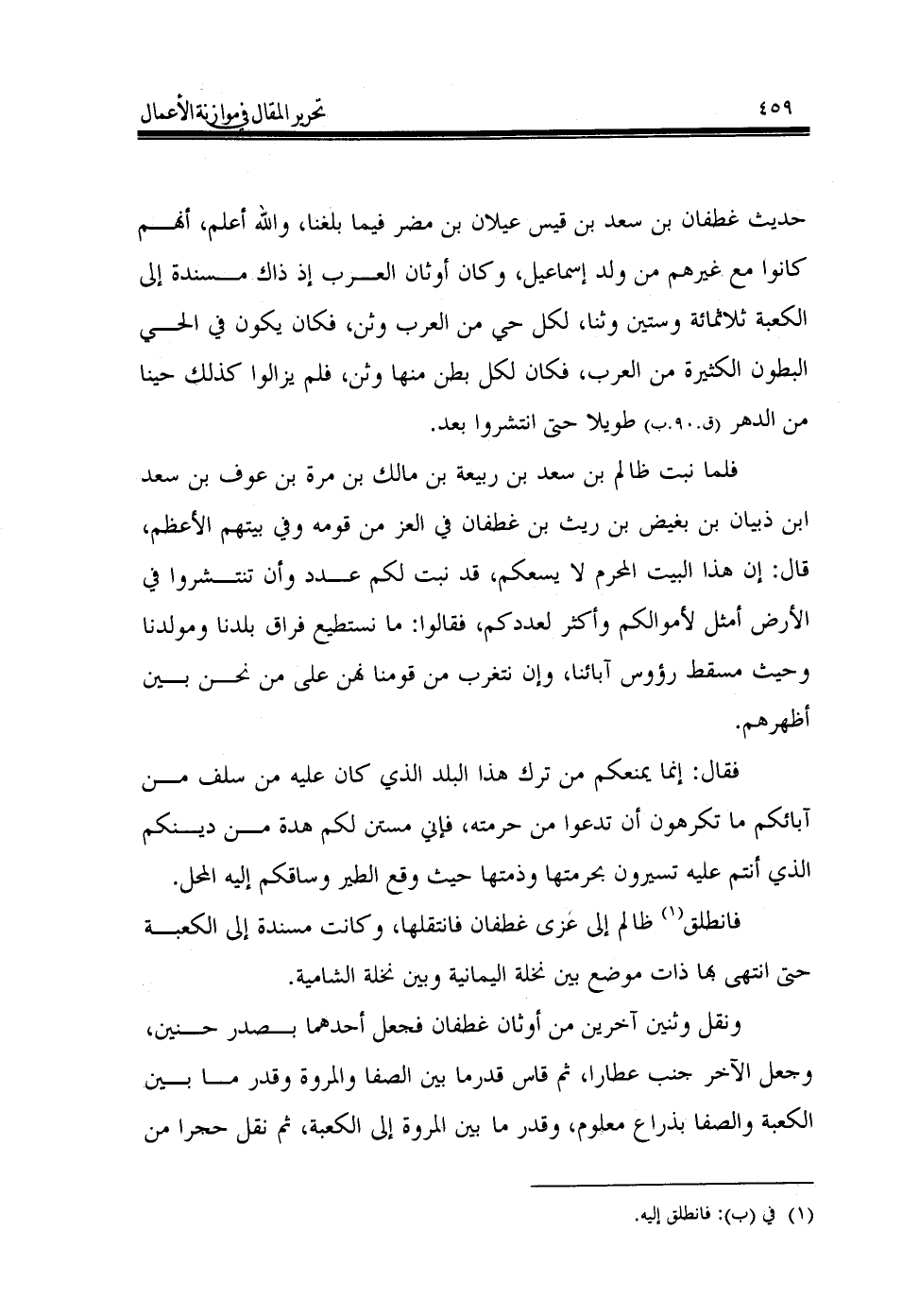 حديث غطفان بن سعد بن قيس عيلان بن مضر فيما بلغنا، والله أعلم، أنهم كانوا مع غيرهم من ولد إسماعيل، وكان أوثان العرب إذ ذاك مسندة إلى الكعبة ثلاثمائة وستين وثنا، لكل حي من العرب وثن، فكان يكون في الحي البطون الكثيرة من العرب، فكان لكل بطن منها وثن، فلم يزالوا كذلك حينا من الدهر (ق.90.ب) طويلا حتى انتشروا بعد.