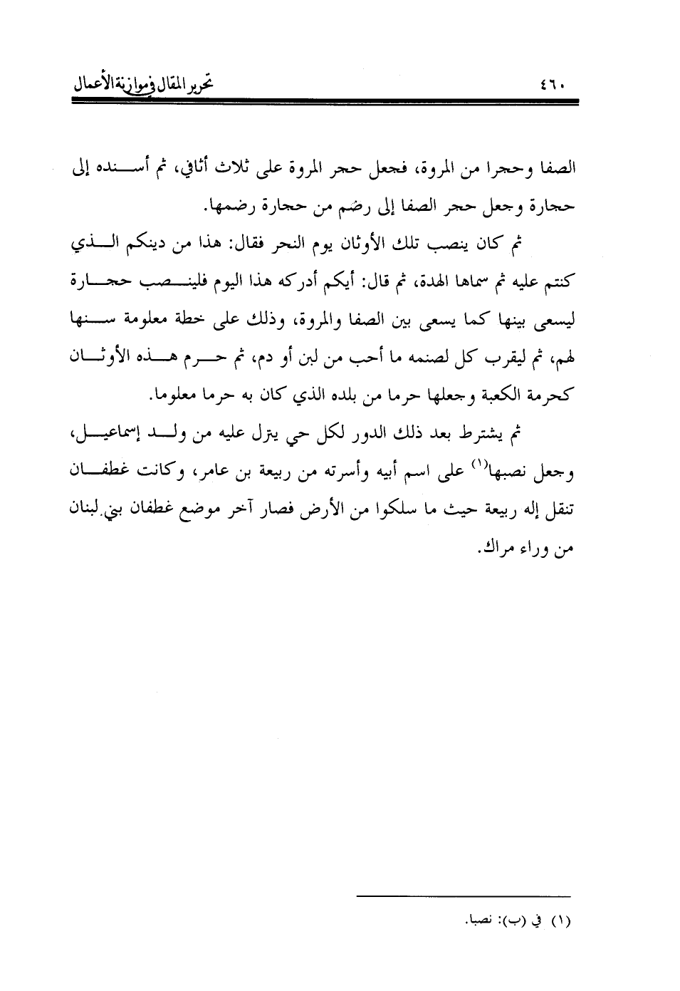 ثم يشترط بعد ذلك الدور لكل حي ينزل عليه من ولد إسماعيل، وجعل نصبها (¬1) على اسم أبيه وأسرته من ربيعة بن عامر، وكانت غطفان تنقل إله ربيعة حيث ما سلكوا من الأرض فصار آخر موضع غطفان بني لبنان من وراء مراك.