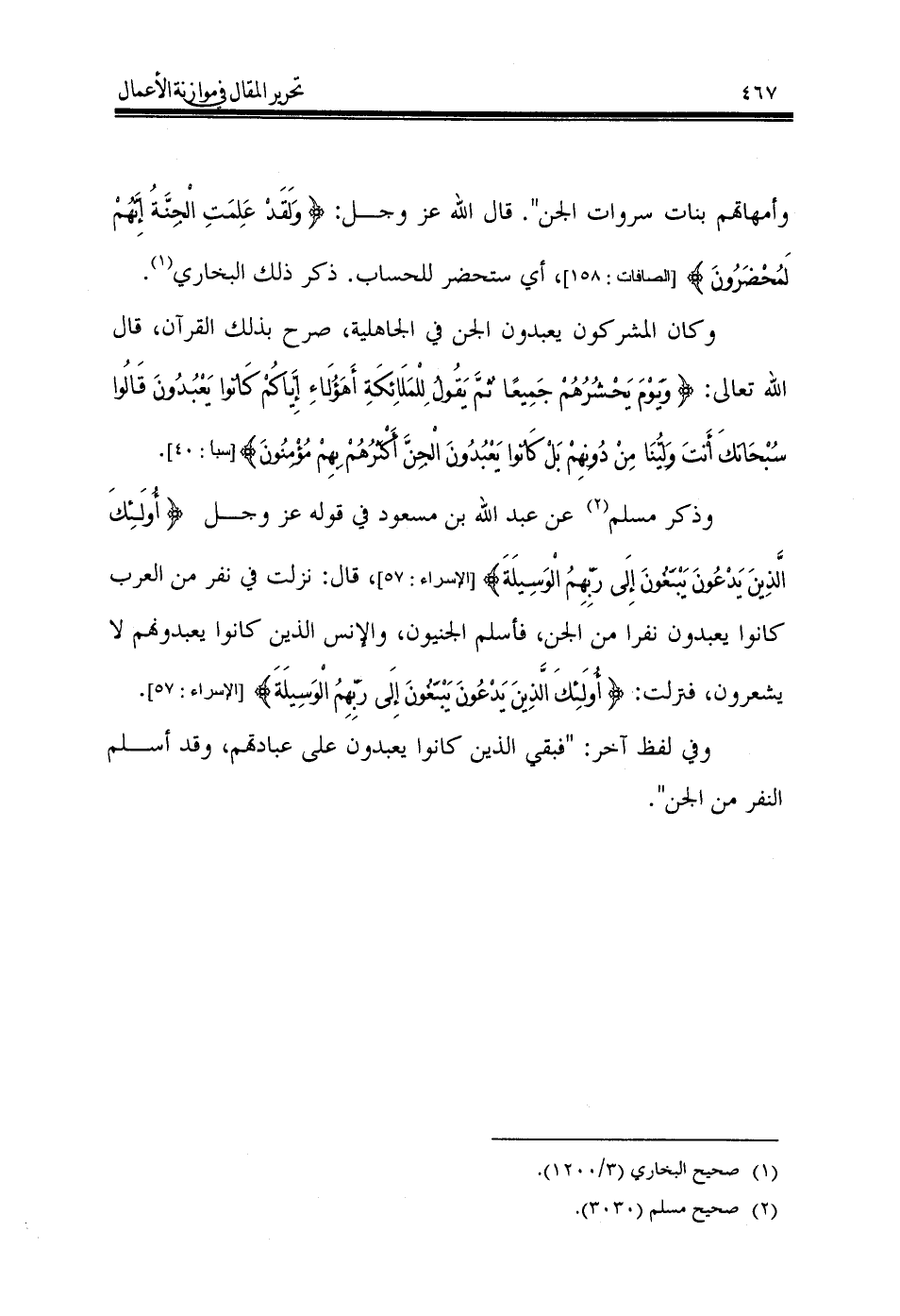 وذكر مسلم (¬2) عن عبد الله بن مسعود في قوله عز وجل {أُولَئِكَ الَّذِينَ يَدْعُونَ يَبْتَغُونَ إِلَى رَبِّهِمُ الْوَسِيلَةَ} [الإسراء: 57]، قال: نزلت في نفر من العرب كانوا يعبدون نفرا من الجن، فأسلم الجنيون، والإنس الذين كانوا يعبدونهم لا يشعرون، فنزلت: {أُولَئِكَ الَّذِينَ يَدْعُونَ يَبْتَغُونَ إِلَى رَبِّهِمُ الْوَسِيلَةَ} [الإسراء: 57].