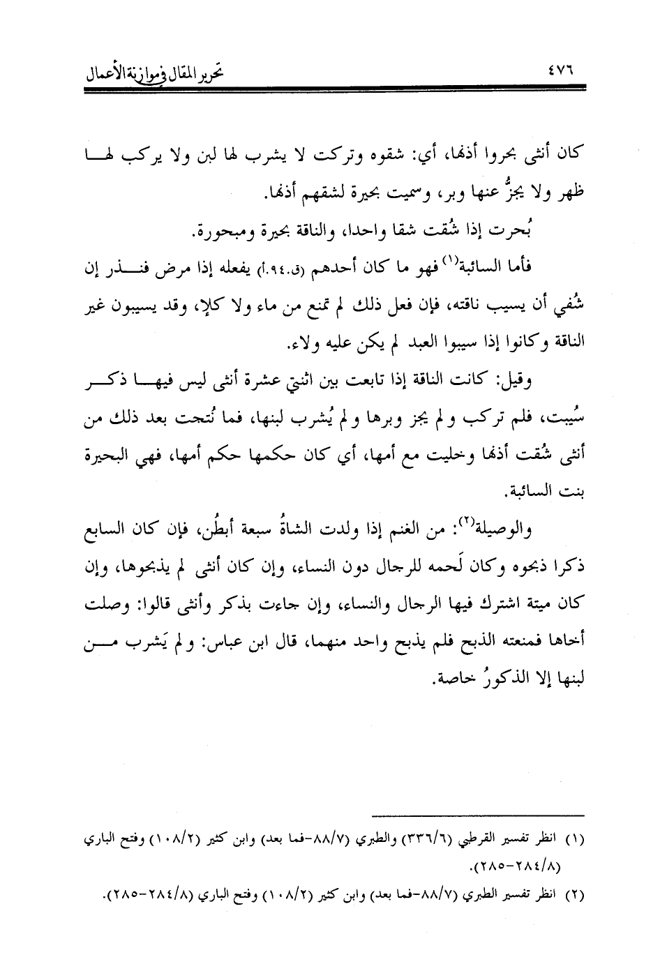كان أنثى بحروا أذنها، أي: شقوه وتركت لا يشرب لها لبن ولا يركب لها ظهر ولا يجزُّ عنها وبر، وسميت بحيرة لشقهم أذنها.