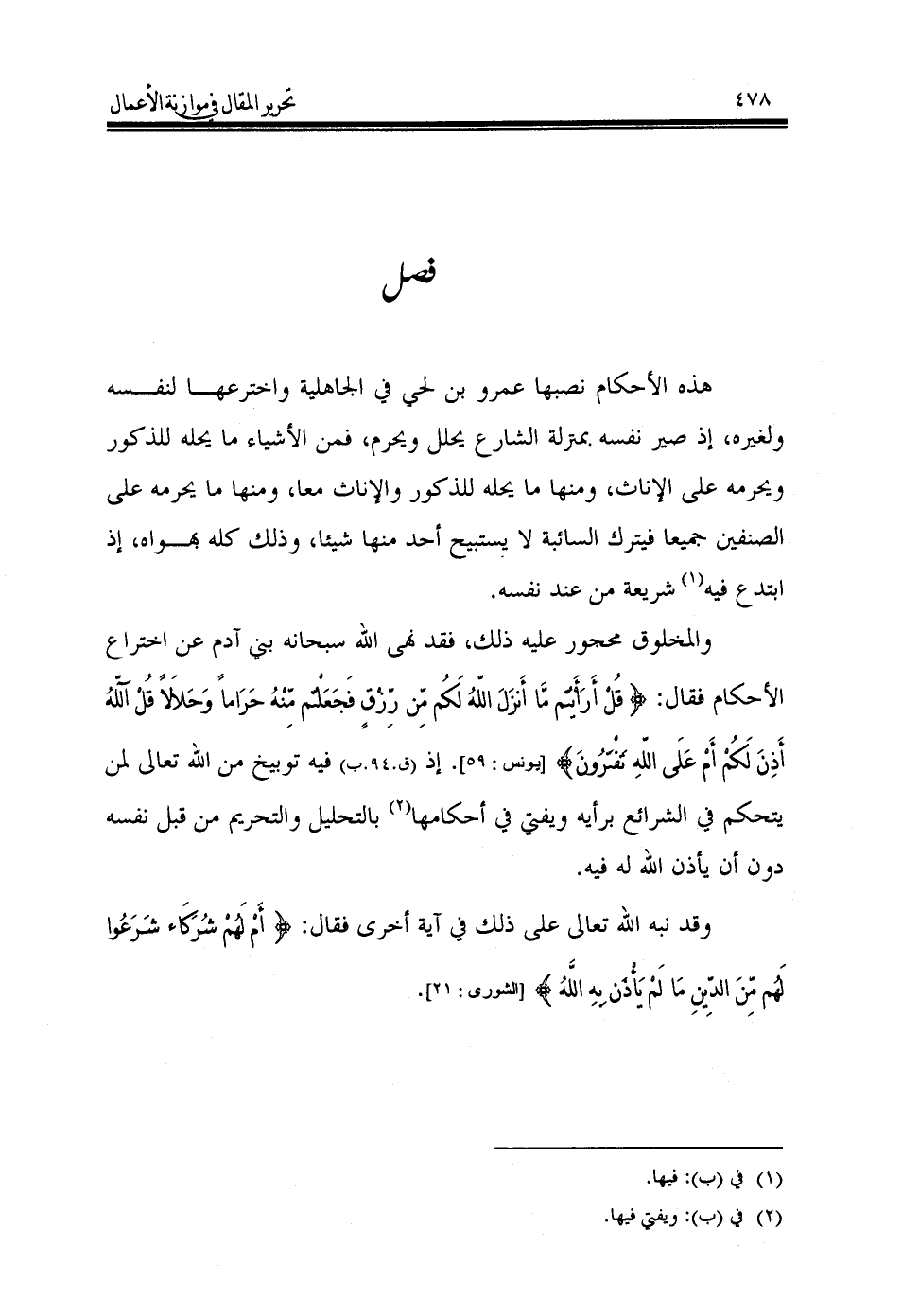 والمخلوق محجور عليه ذلك، فقد نهى الله سبحانه بني آدم عن اختراع الأحكام فقال: {قُلْ أَرَأَيْتُم مَّا أَنزَلَ اللهُ لَكُم مِّن رِّزْقٍ فَجَعَلْتُم مِّنْهُ حَرَاماً وَحَلاَلاً قُلْ آللهُ أَذِنَ لَكُمْ أَمْ عَلَى اللهِ تَفْتَرُونَ} [يونس: 59]. إذ (ق.94.ب) فيه توبيخ من الله تعالى لمن يتحكم في الشرائع برأيه ويفتي في أحكامها (¬2) بالتحليل والتحريم من قبل نفسه دون أن يأذن الله له فيه.