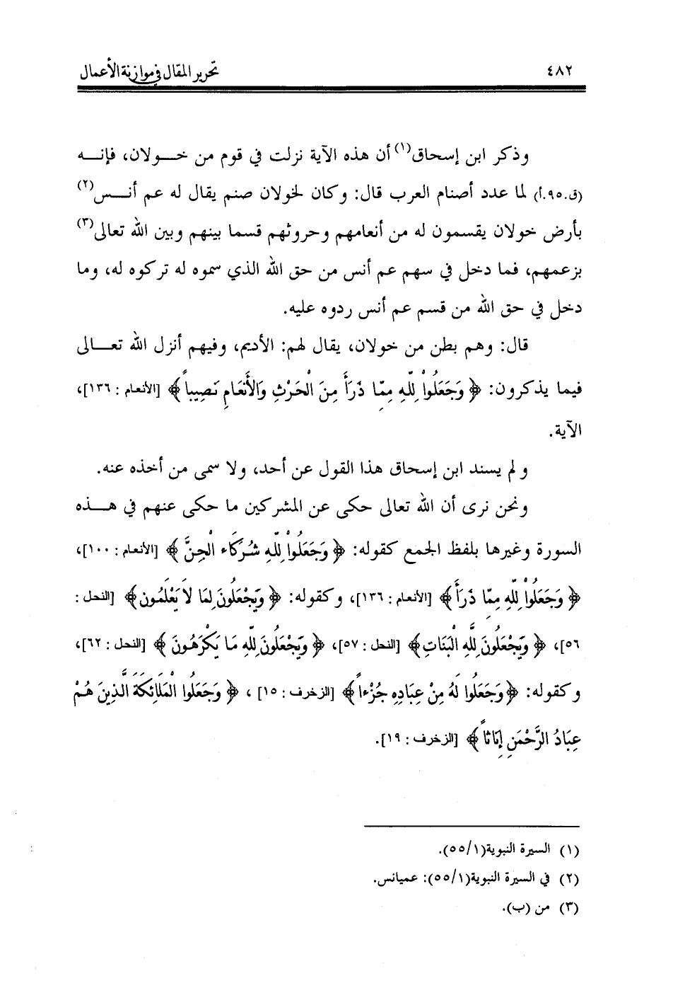وذكر ابن إسحاق (¬1) أن هذه الآية نزلت في قوم من خولان، فإنه (ق.95.أ) لما عدد أصنام العرب قال: وكان لخولان صنم يقال له عم أنس (¬2) بأرض خولان يقسمون له من أنعامهم وحروثهم قسما بينهم وبين الله تعالى (¬3) بزعمهم، فما دخل في سهم عم أنس من حق الله الذي سموه له تركوه له، وما دخل في حق الله من قسم عم أنس ردوه عليه.
