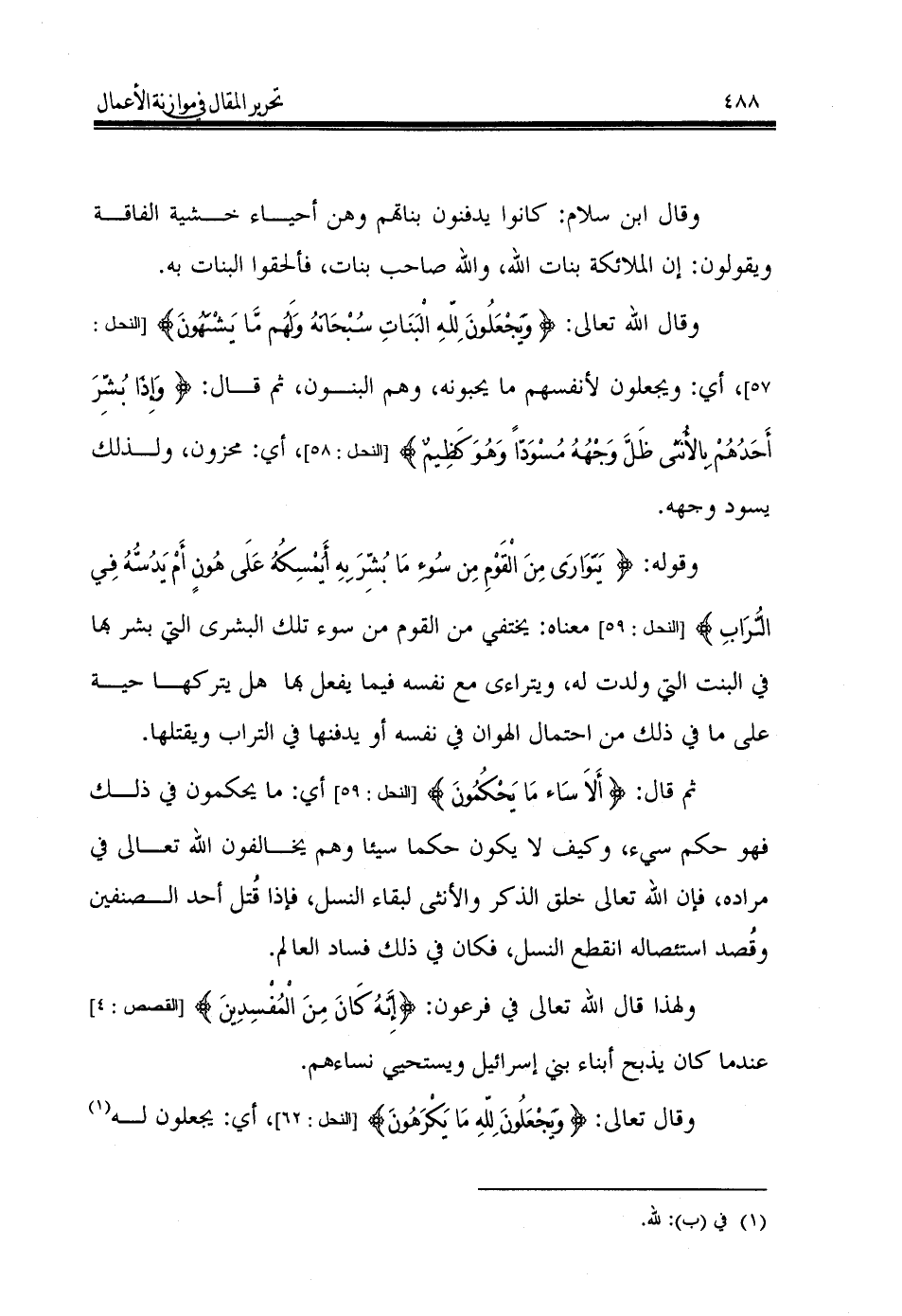 وقال الله تعالى: {وَيَجْعَلُونَ لِلّهِ الْبَنَاتِ سُبْحَانَهُ وَلَهُم مَّا يَشْتَهُونَ} [النحل: 57]، أي: ويجعلون لأنفسهم ما يحبونه، وهم البنون، ثم قال: {وَإِذَا بُشِّرَ أَحَدُهُمْ بِالأُنثَى ظَلَّ وَجْهُهُ مُسْوَدّاً وَهُوَ كَظِيمٌ} [النحل: 58]، أي: محزون، ولذلك يسود وجهه.