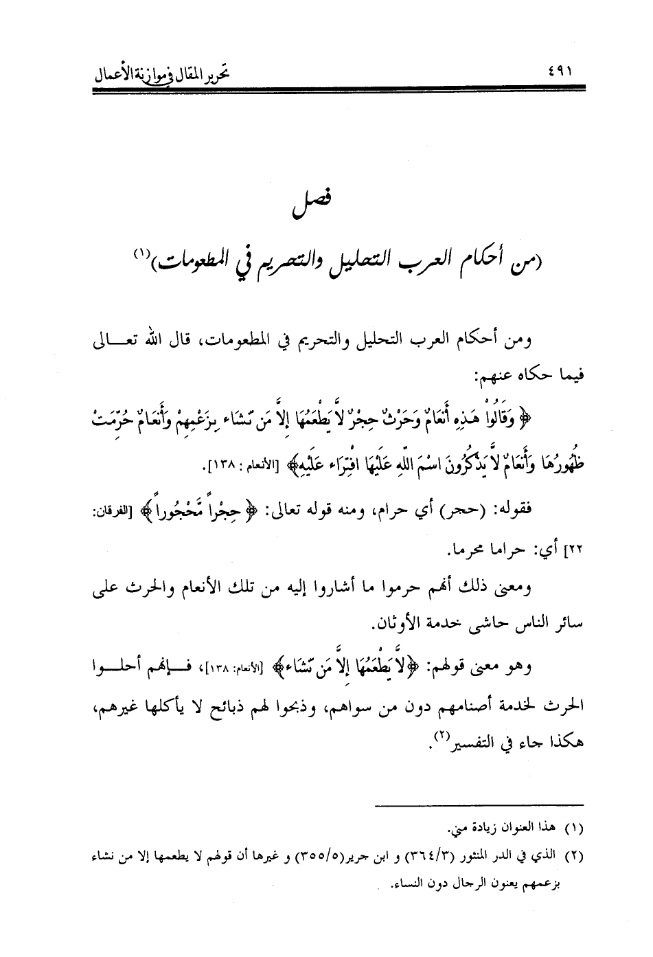 وهو معنى قولهم: {لاَّ يَطْعَمُهَا إِلاَّ مَن نّشَاء} [الأنعام: 138]، فإنهم أحلوا الحرث لخدمة أصنامهم دون من سواهم، وذبحوا لهم ذبائح لا يأكلها غيرهم، هكذا جاء في التفسير (¬2).