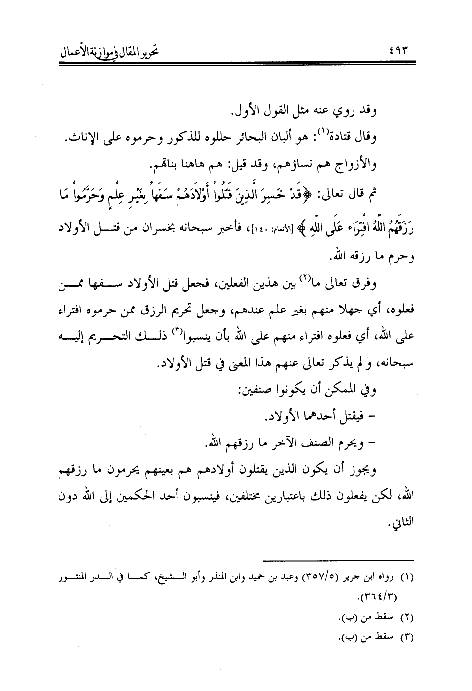 وفرق تعالى ما (¬2) بين هذين الفعلين، فجعل قتل الأولاد سفها ممن فعلوه، أي جهلا منهم بغير علم عندهم، وجعل تحريم الرزق ممن حرموه افتراء على الله، أي فعلوه افتراء منهم على الله بأن ينسبوا (¬3) ذلك التحريم إليه سبحانه، ولم يذكر تعالى عنهم هذا المعنى في قتل الأولاد.