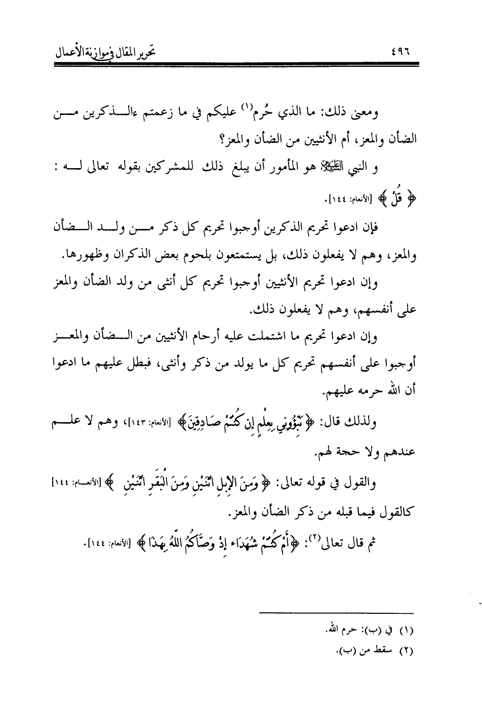 ومعنى ذلك: ما الذي حُرم (¬1) عليكم في ما زعمتم ءالذكرين من الضأن والمعز، أم الأنثيين من الضأن والمعز؟
