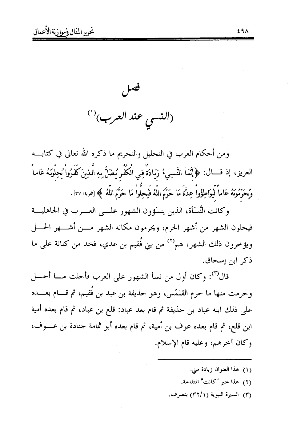 وكانت النَّسَأة، الذين ينسَؤون الشهور على العرب في الجاهلية فيحلون الشهر من أشهر الحرم، ويحرمون مكانه الشهر من أشهر الحل ويؤخرون ذلك الشهر، هم (¬2) من بني فُقيم بن عدي، فخد من كنانة على ما ذكر ابن إسحاق.