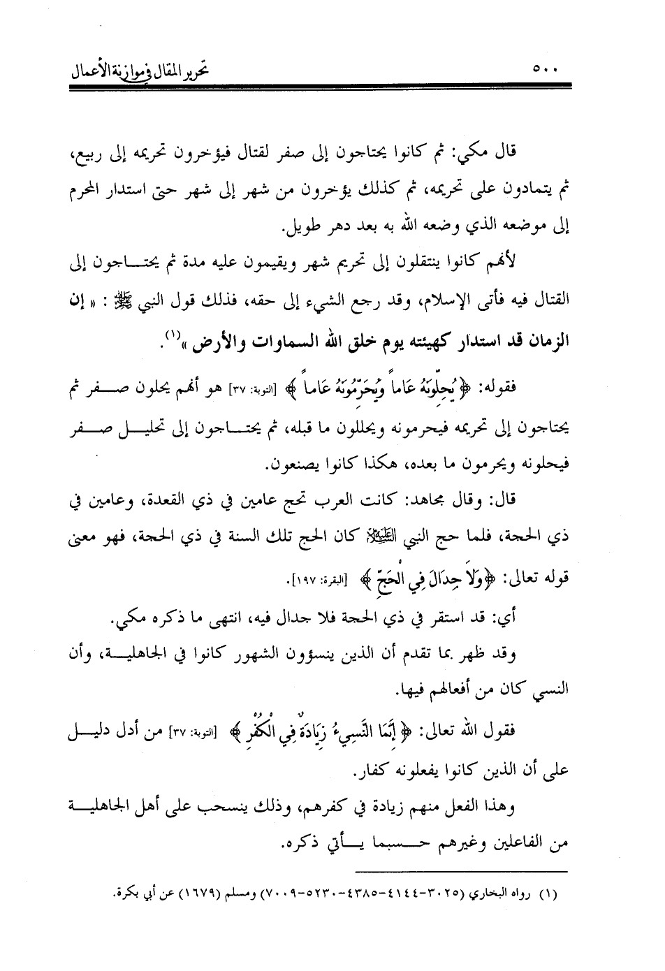 لأنهم كانوا ينتقلون إلى تحريم شهر ويقيمون عليه مدة ثم يحتاجون إلى القتال فيه فأتى الإسلام، وقد رجع الشيء إلى حقه، فذلك قول النبي - صَلَّى اللهُ عَلَيْهِ وَسَلَّمَ -: «إن الزمان قد استدار كهيئته يوم خلق الله السماوات والأرض» (¬1).
