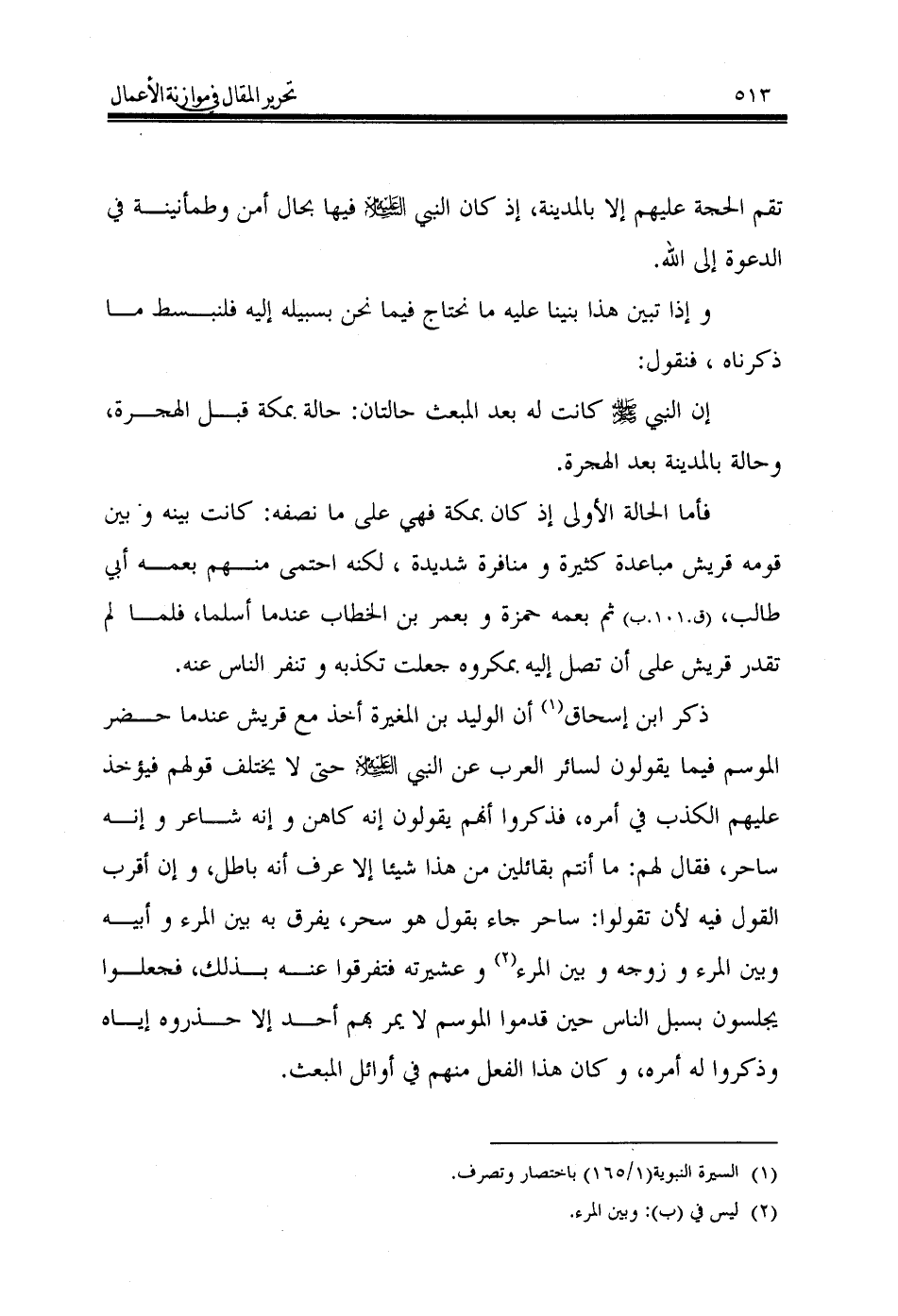فأما الحالة الأولى إذ كان بمكة فهي على ما نصفه: كانت بينه وبين قومه قريش مباعدة كثيرة ومنافرة شديدة , لكنه احتمى منهم بعمه أبي طالب, (ق.101.ب) ثم بعمه حمزة وبعمر بن الخطاب عندما أسلما, فلما لم تقدر قريش على أن تصل إليه بمكروه جعلت تكذبه وتنفر الناس عنه.
