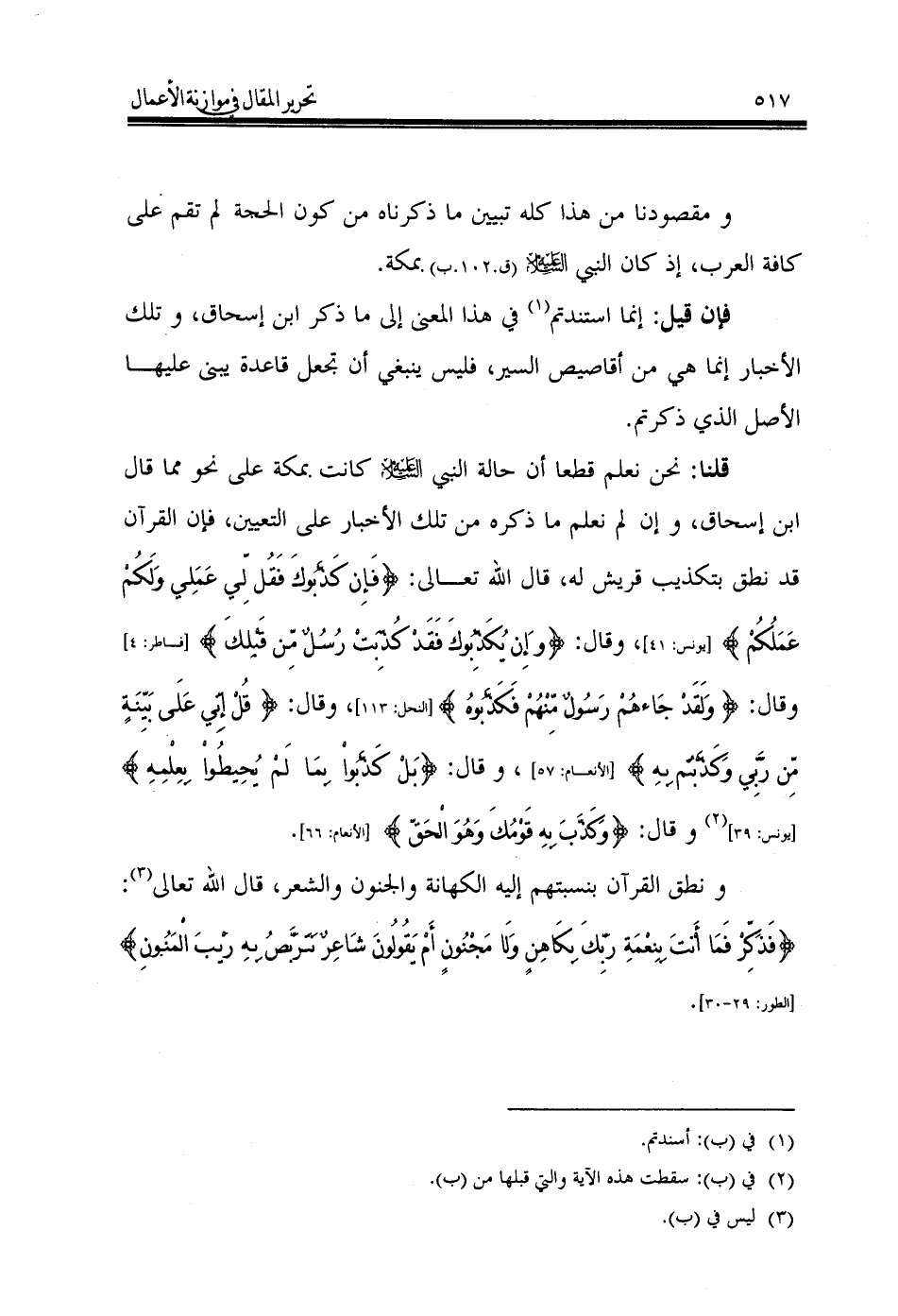 قلنا: نحن نعلم قطعا أن حالة النبي - عليه السلام - كانت بمكة على نحو مما قال ابن إسحاق، وإن لم نعلم ما ذكره من تلك الأخبار على التعيين، فإن القرآن قد نطق بتكذيب قريش له، قال الله تعالى: {فَإِن كَذَّبُوكَ فَقُل لِّي عَمَلِي وَلَكُمْ عَمَلُكُمْ} [يونس: 41]، وقال: {و َإِن يُكَذِّبُوكَ فَقَدْ كُذِّبَتْ رُسُلٌ مِّن قَبْلِكَ} [فاطر: 4] وقال: {وَلَقَدْ جَاءهُمْ رَسُولٌ مِّنْهُمْ فَكَذَّبُوهُ} [النحل: 113]، وقال: {قُلْ إِنِّي عَلَى بَيِّنَةٍ مِّن رَّبِّي وَكَذَّبْتُم بِهِ} [الأنعام: 57]، وقال: {بَلْ كَذَّبُوا بِمَا لَمْ يُحِيطُوا بِعِلْمِهِ} [يونس: 39] (¬2) وقال: {وَكَذَّبَ بِهِ قَوْمُكَ وَهُوَ الْحَقّ} [الأنعام: 66].