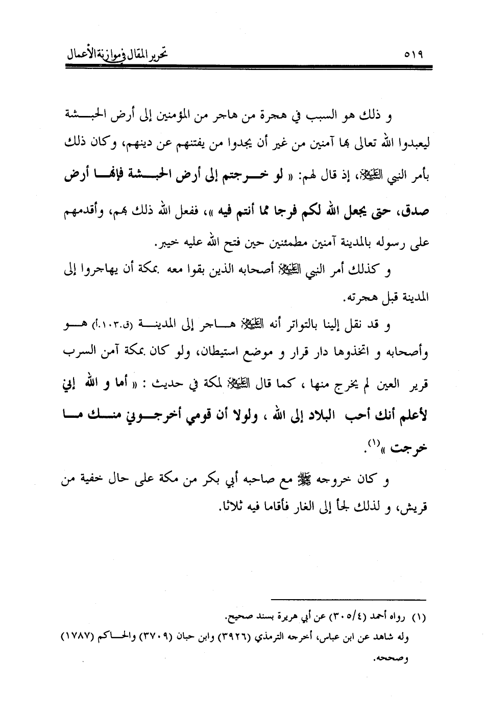 وقد نقل إلينا بالتواتر أنه - عليه السلام - هاجر إلى المدينة (ق.103.أ) هو وأصحابه واتخذوها دار قرار وموضع استيطان، ولو كان بمكة آمن السرب قرير العين لم يخرج منها , كما قال - عليه السلام - لمكة في حديث: «أما والله إني لأعلم أنك أحب البلاد إلى الله، ولولا أن قومي أخرجوني منك ما خرجت» (¬1).