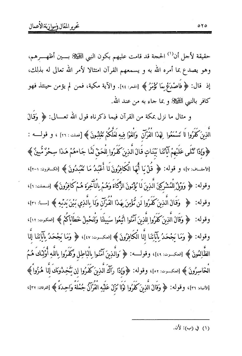 ومثال ما نزل بمكة من القرآن فيما ذكرناه قول الله تعالى: {وَقَالَ الَّذِينَ كَفَرُوا لَا تَسْمَعُوا لِهَذَا الْقُرْآنِ وَالْغَوْا فِيهِ لَعَلَّكُمْ تَغْلِبُونَ} [فصلت: 26]، وقوله: {وَإِذَا تُتْلَى عَلَيْهِمْ آيَاتُنَا بَيِّنَاتٍ قَالَ الَّذِينَ كَفَرُوا لِلْحَقِّ لَمَّا جَاءهُمْ هَذَا سِحْرٌ مُّبِينٌ} [الأحقاف: 7]، وقوله: {قُلْ يَا أَيُّهَا الْكَافِرُونَ لَا أَعْبُدُ مَا تَعْبُدُونَ} [الكافرون: 1 - 2]، وقوله: {وَوَيْلٌ لِلْمُشْرِكِينَ الَّذِينَ لَا يُؤْتُونَ الزَّكَاةَ وَهُمْ بِالْآَخِرَةِ هُمْ كَافِرُونَ} [فصلت: 6]، وقوله: {وَقَالَ الَّذِينَ كَفَرُوا لَن نُّؤْمِنَ بِهَذَا الْقُرْآنِ وَلَا بِالَّذِي بَيْنَ يَدَيْهِ} [سبأ: 31]، وقوله: {وَقَالَ الَّذِينَ كَفَرُوا لِلَّذِينَ آمَنُوا اتَّبِعُوا سَبِيلَنَا وَلْنَحْمِلْ خَطَايَاكُمْ} [العنكبوت: 12]، وقوله: {وَمَا يَجْحَدُ بِآيَاتِنَا إِلَّا الْكَافِرُونَ} [العنكبوت: 47]، {وَمَا يَجْحَدُ بِآيَاتِنَا إِلَّا الظَّالِمُونَ} [العنكبوت: 49]، وقوله: {َوالَّذِينَ آمَنُوا بِالْبَاطِلِ وَكَفَرُوا بِاللَّهِ أُوْلَئِكَ هُمُ الْخَاسِرُونَ} [العنكبوت: 52]، وقوله: {وَإِذَا رَآكَ الَّذِينَ كَفَرُوا إِن يَتَّخِذُونَكَ إِلَّا هُزُواً} [الأنبياء: 36]، وقوله: {وَقَالَ الَّذِينَ كَفَرُوا لَوْلَا نُزِّلَ عَلَيْهِ الْقُرْآنُ جُمْلَةً وَاحِدَةً} [الفرقان: 32]،