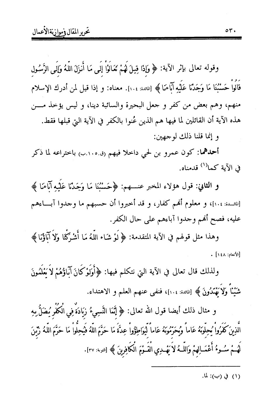 أحدهما: كون عمرو بن لحي داخلا فيهم (ق.105.ب) باختراعه لما ذكر في الآية كما (¬1) قدمناه.