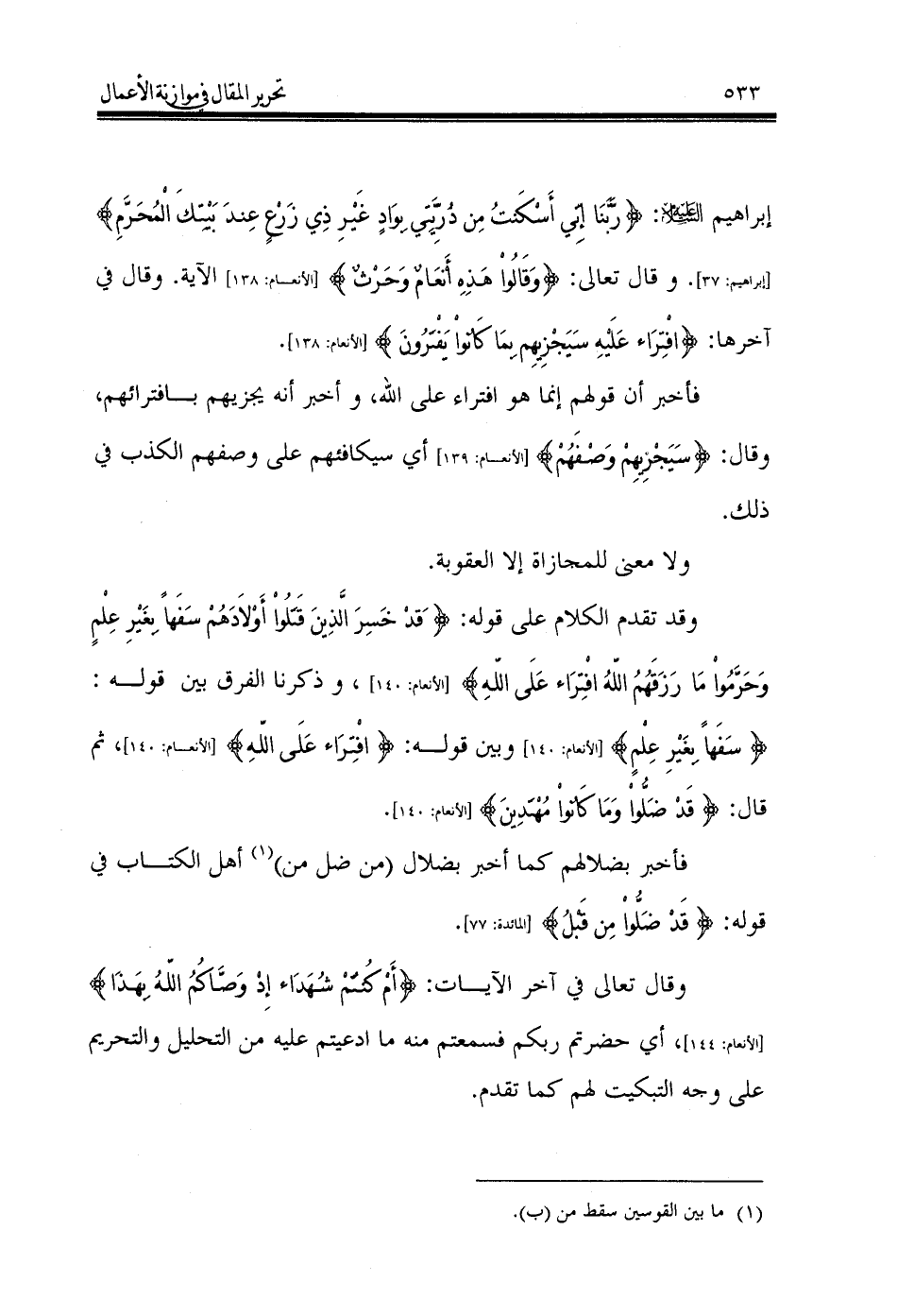 إبراهيم - عليه السلام -: {رَّبَّنَا إِنِّي أَسْكَنتُ مِن ذُرِّيَّتِي بِوَادٍ غَيْرِ ذِي زَرْعٍ عِندَ بَيْتِكَ الْمُحَرَّمِ} [إبراهيم: 37]. وقال تعالى: {وَقَالُوا هَذِهِ أَنْعَامٌ وَحَرْثٌ} [الأنعام: 138] الآية. وقال في آخرها: {افْتِرَاء عَلَيْهِ سَيَجْزِيهِم بِمَا كَانُوا يَفْتَرُونَ} [الأنعام: 138].