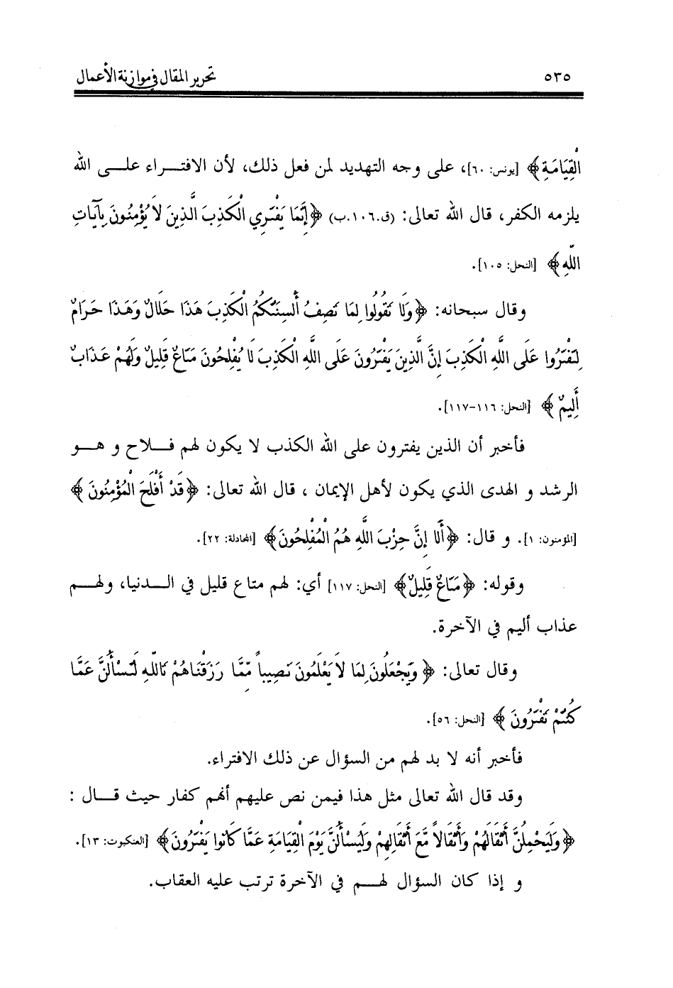 وقال سبحانه: {وَلَا تَقُولُوا لِمَا تَصِفُ أَلْسِنَتُكُمُ الْكَذِبَ هَذَا حَلَالٌ وَهَذَا حَرَامٌ لِتَفْتَرُوا عَلَى اللَّهِ الْكَذِبَ إِنَّ الَّذِينَ يَفْتَرُونَ عَلَى اللَّهِ الْكَذِبَ لَا يُفْلِحُونَ مَتَاعٌ قَلِيلٌ وَلَهُمْ عَذَابٌ أَلِيمٌ} ... [النحل: 116 - 117].