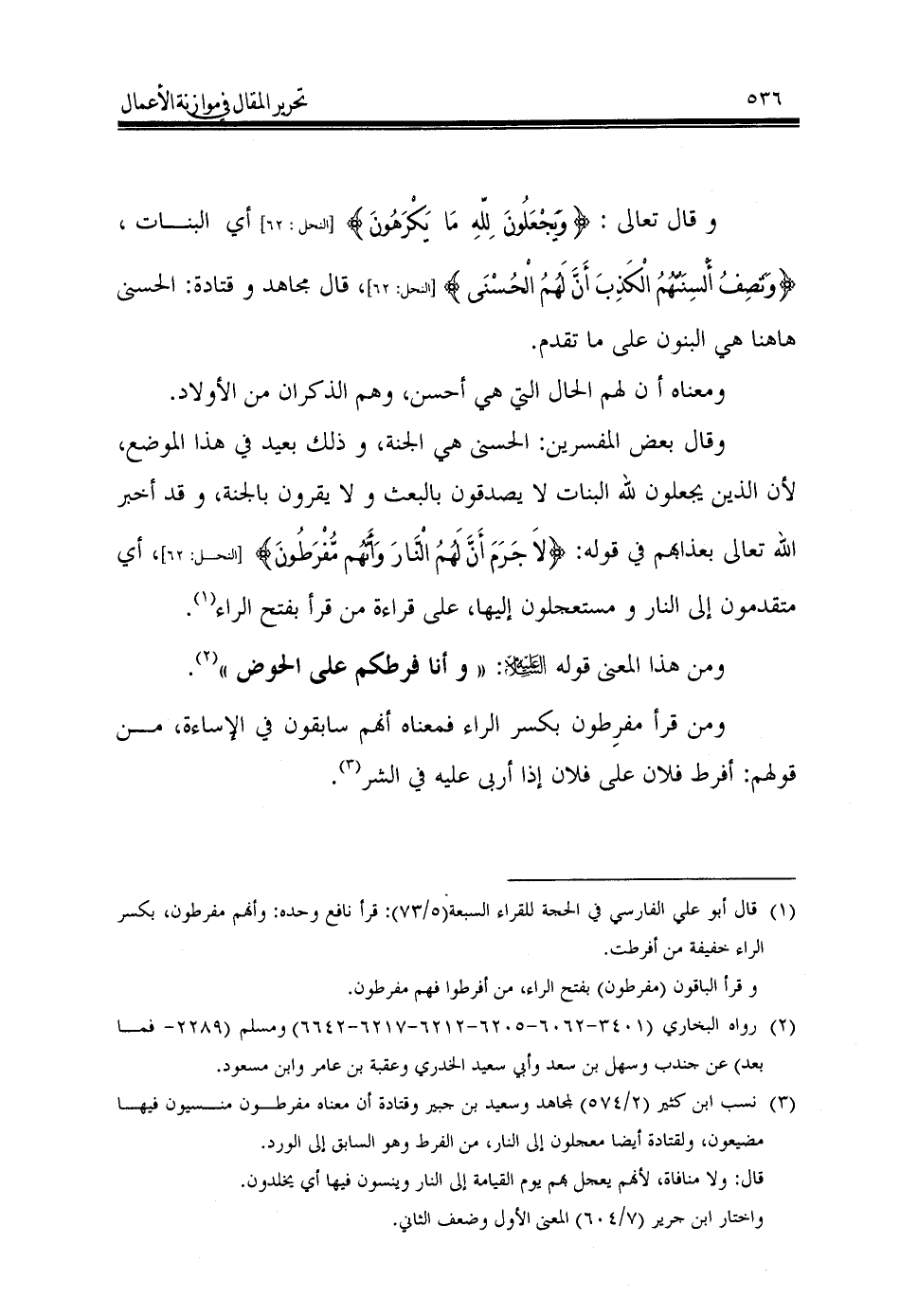 وقال بعض المفسرين: الحسنى هي الجنة، وذلك بعيد في هذا الموضع، لأن الذين يجعلون لله البنات لا يصدقون بالبعث ولا يقرون بالجنة، وقد أخبر الله تعالى بعذابهم في قوله: {لاَ جَرَمَ أَنَّ لَهُمُ الْنَّارَ وَأَنَّهُم مُّفْرَطُونَ} [النحل: 62]، أي متقدمون إلى النار ومستعجلون إليها، على قراءة من قرأ بفتح الراء (¬1).