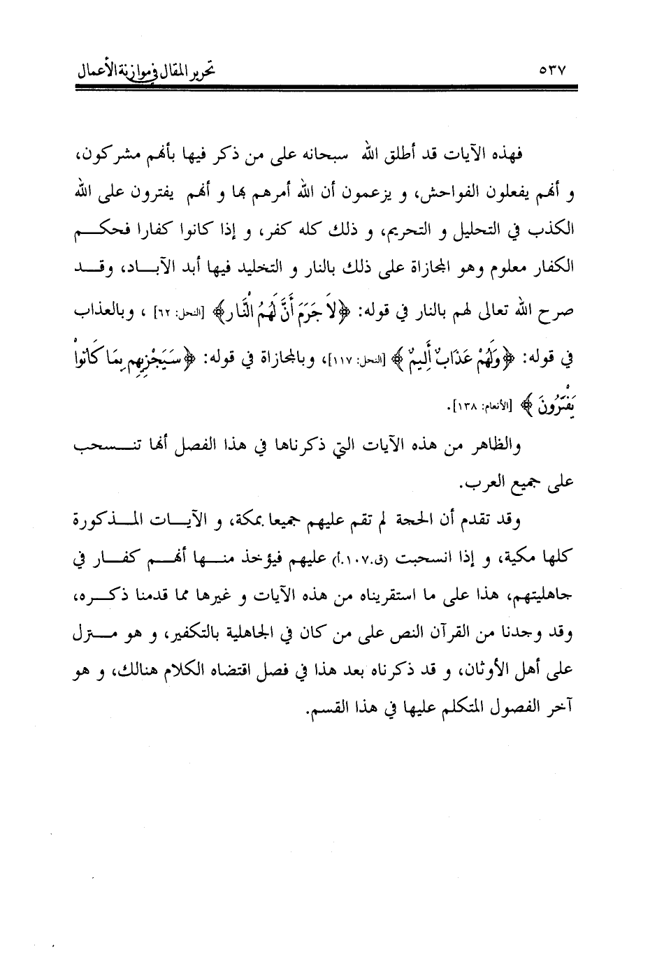 وقد تقدم أن الحجة لم تقم عليهم جميعا بمكة، والآيات المذكورة كلها مكية، وإذا انسحبت (ق.107.أ) عليهم فيؤخذ منها أنهم كفار في جاهليتهم، هذا على ما استقريناه من هذه الآيات وغيرها مما قدمنا ذكره، وقد وجدنا من القرآن النص على من كان في الجاهلية بالتكفير، وهو منزل على أهل الأوثان، وقد ذكرناه بعد هذا في فصل اقتضاه الكلام هنالك، وهو آخر الفصول المتكلم عليها في هذا القسم.