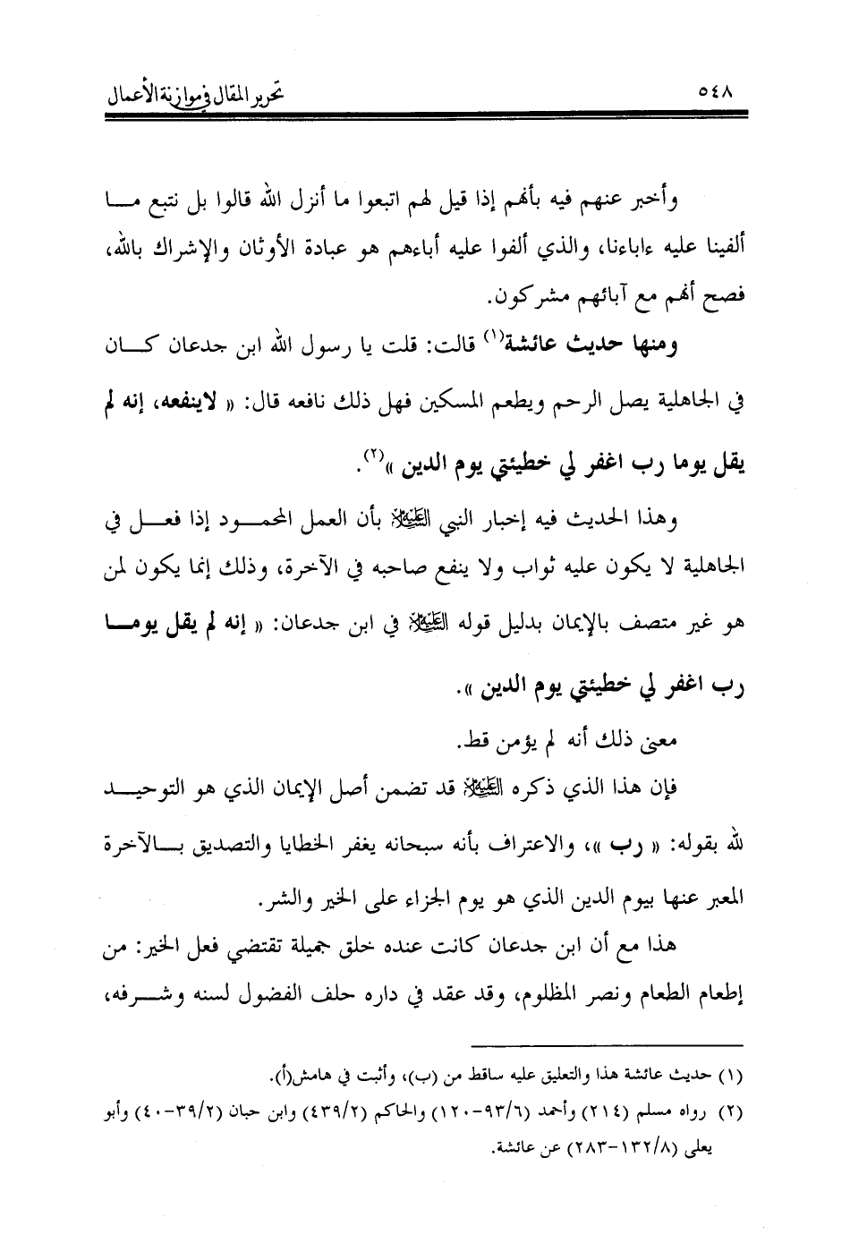 ومنها حديث عائشة (¬1) قالت: قلت يا رسول الله ابن جدعان كان في الجاهلية يصل الرحم ويطعم المسكين فهل ذلك نافعه قال: «لاينفعه، إنه لم يقل يوما رب اغفر لي خطيئتي يوم الدين» (¬2).