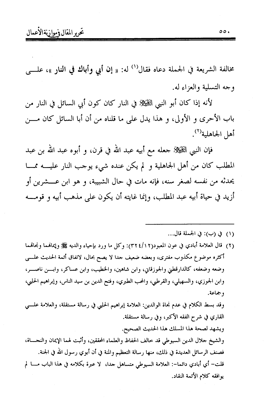 (¬2) قال العلامة أبادي في عون المعبود (12/ 324): وكل ما ورد بإحياء والديه - صَلَّى اللهُ عَلَيْهِ وَسَلَّمَ - وإيمانهما ونجاتهما أكثره موضوع مكذوب مفترى، وبعضه ضعيف جدا لا يصح بحال، لاتفاق أئمة الحديث على وضعه وضعفه، كالدارقطني والجوزقاني، وابن شاهين، والخطيب، وابن عساكر، وابن ناصر، وابن الجوزي، والسهيلي، والقرطبي، والمحب الطبري، وفتح الدين بن سيد الناس، وإبراهيم الحلبي، وجماعة.
