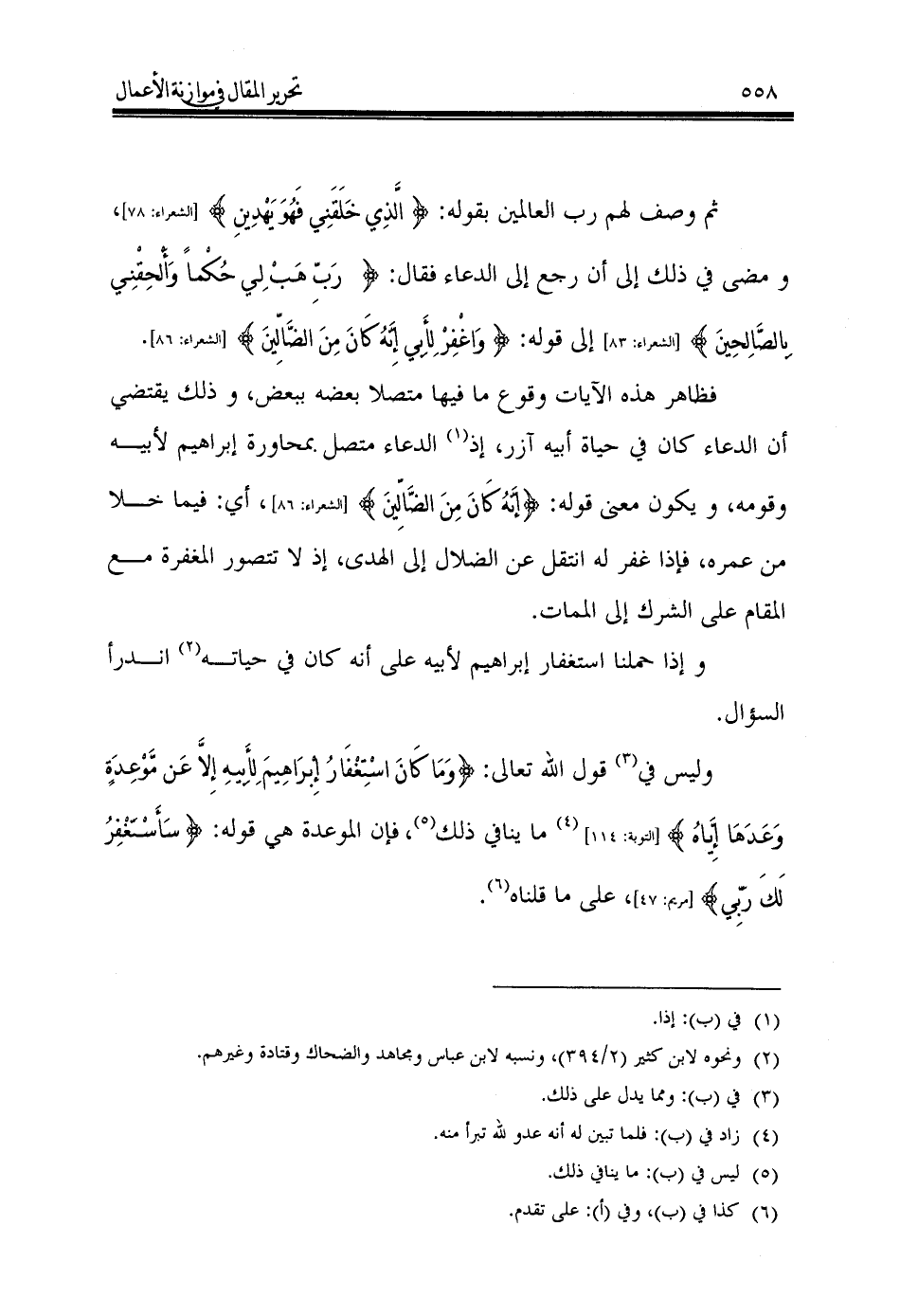 وليس في (¬3) قول الله تعالى: {وَمَا كَانَ اسْتِغْفَارُ إِبْرَاهِيمَ لِأَبِيهِ إِلاَّ عَن مَّوْعِدَةٍ وَعَدَهَا إِيَّاهُ} [التوبة: 114] (¬4) ما ينافي ذلك (¬5)، فإن الموعدة هي قوله: {سَأَسْتَغْفِرُ لَكَ رَبِّي} [مريم: 47]، على ما قلناه (¬6).