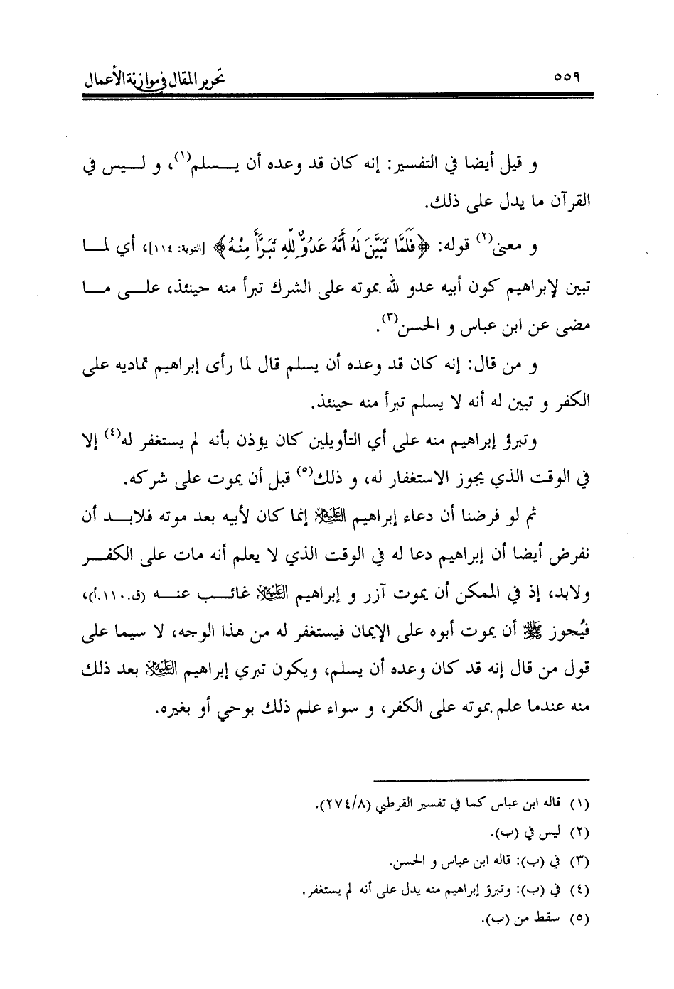 ثم لو فرضنا أن دعاء إبراهيم - عليه السلام - إنما كان لأبيه بعد موته فلابد أن نفرض أيضا أن إبراهيم دعا له في الوقت الذي لا يعلم أنه مات على الكفر ولابد، إذ في الممكن أن يموت آزر وإبراهيم - عليه السلام - غائب عنه (ق.110.أ)، فيُجوز - صَلَّى اللهُ عَلَيْهِ وَسَلَّمَ - أن يموت أبوه على الإيمان فيستغفر له من هذا الوجه، لا سيما على قول من قال إنه قد كان وعده أن يسلم، ويكون تبري إبراهيم - عليه السلام - بعد ذلك منه عندما علم بموته على الكفر، وسواء علم ذلك بوحي أو بغيره.