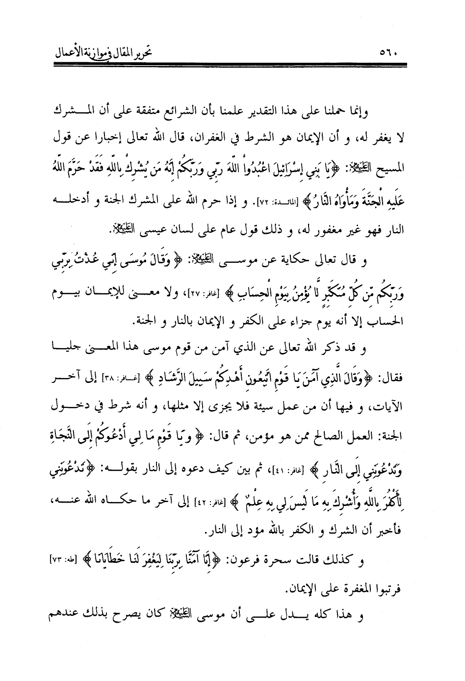 وقد ذكر الله تعالى عن الذي آمن من قوم موسى هذا المعنى جليا فقال: {وَقَالَ الَّذِي آمَنَ يَا قَوْمِ اتَّبِعُونِ أَهْدِكُمْ سَبِيلَ الرَّشَادِ} [غافر: 38] إلى آخر الآيات، وفيها أن من عمل سيئة فلا يجزى إلا مثلها، وأنه شرط في دخول الجنة: العمل الصالح ممن هو مؤمن، ثم قال: {و َيَا قَوْمِ مَا لِي أَدْعُوكُمْ إِلَى النَّجَاةِ وَتَدْعُونَنِي إِلَى النَّارِ} [غافر: 41]، ثم بين كيف دعوه إلى النار بقوله: {تَدْعُونَنِي لِأَكْفُرَ بِاللَّهِ وَأُشْرِكَ بِهِ مَا لَيْسَ لِي بِهِ عِلْمٌ} [غافر: 42] إلى آخر ما حكاه الله عنه، فأخبر أن الشرك والكفر بالله مؤد إلى النار.