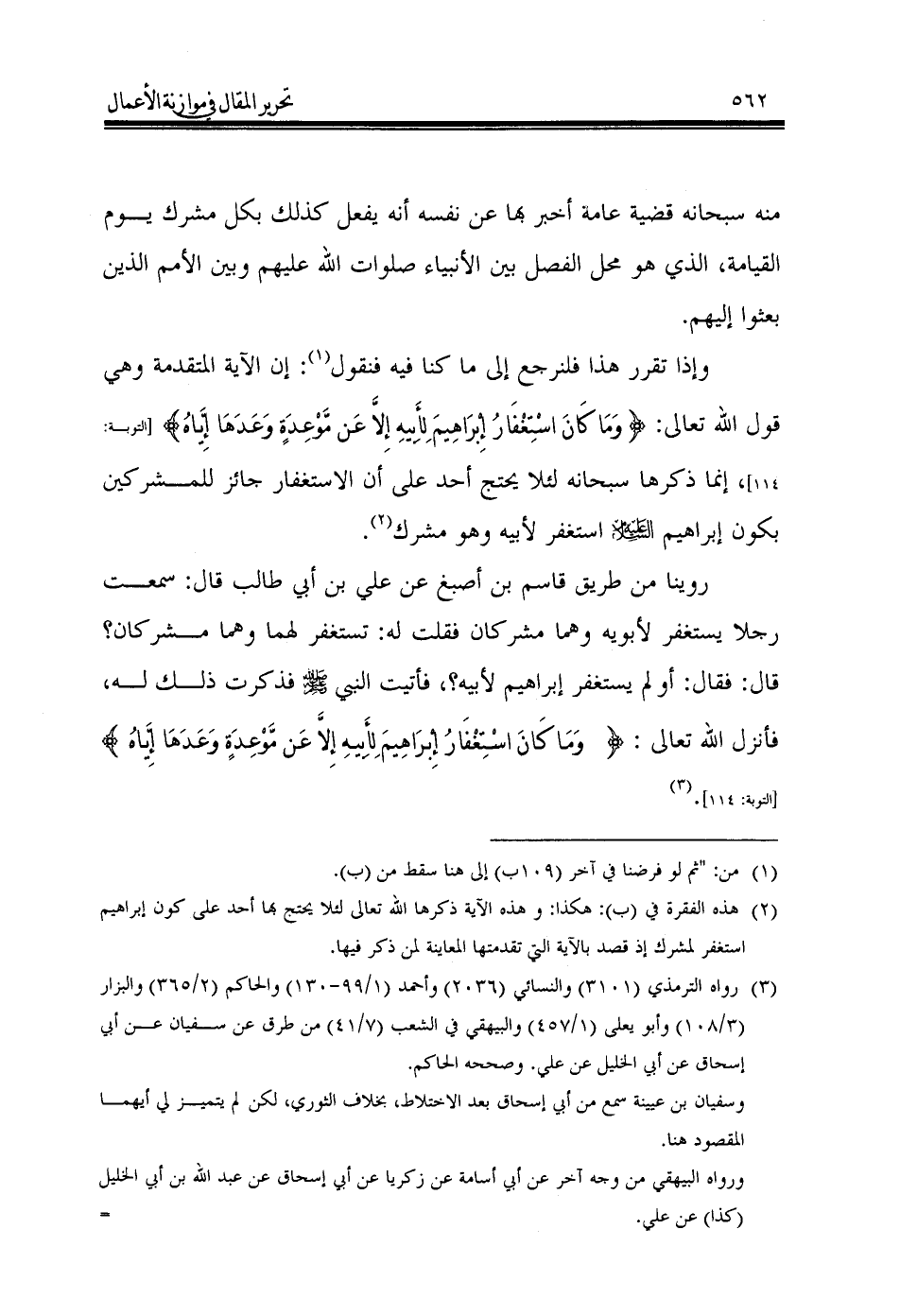 وإذا تقرر هذا فلنرجع إلى ما كنا فيه فنقول (¬1): إن الآية المتقدمة وهي قول الله تعالى: {وَمَا كَانَ اسْتِغْفَارُ إِبْرَاهِيمَ لِأَبِيهِ إِلاَّ عَن مَّوْعِدَةٍ وَعَدَهَا إِيَّاهُ} [التوبة: 114] , إنما ذكرها سبحانه لئلا يحتج أحد على أن الاستغفار جائز للمشركين بكون إبراهيم - عليه السلام - استغفر لأبيه وهو مشرك (¬2).
