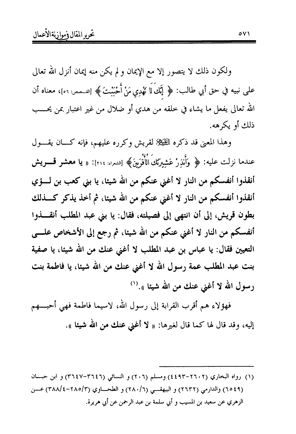 وهذا المعنى قد ذكره - عليه السلام - لقريش وكرره عليهم, فإنه كان يقول عندما نزلت عليه: {وَأَنذِرْ عَشِيرَتَكَ الْأَقْرَبِينَ} [الشعراء: 214]: «يا معشر قريش أنقذوا أنفسكم من النار لا أغني عنكم من الله شيئا، يا بني كعب بن لؤي أنقذوا أنفسكم من النار لا أغني عنكم من الله شيئا, ثم أخذ يذكر كذلك بطون قريش, إلى أن انتهى إلى فصيلته, فقال: يا بني عبد المطلب أنقذوا أنفسكم من النار لا أغني عنكم من الله شيئا, ثم رجع إلى الأشخاص على التعيين فقال: يا عباس بن عبد المطلب لا أغني عنك من الله شيئا, يا صفية بنت عبد المطلب عمة رسول الله لا أغني عنك من الله شيئا, يا فاطمة بنت رسول الله لا أغني عنك من الله شيئا». (¬1)