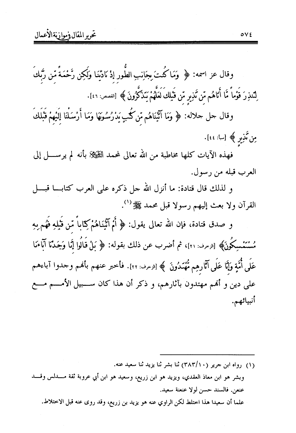 وصدق قتادة، فإن الله تعالى يقول: {أَمْ آتَيْنَاهُمْ كِتَاباً مِّن قَبْلِهِ فَهُم بِهِ مُسْتَمْسِكُونَ} [الزخرف: 21]، ثم أضرب عن ذلك بقوله: {بَلْ قَالُوا إِنَّا وَجَدْنَا آبَاءنَا عَلَى أُمَّةٍ وَإِنَّا عَلَى آثَارِهِم مُّهْتَدُونَ} [الزخرف: 22]. فأخبر عنهم بأنهم وجدوا آباءهم على دين وأنهم مهتدون بآثارهم، وذكر أن هذا كان سبيل الأمم مع أنبيائهم.