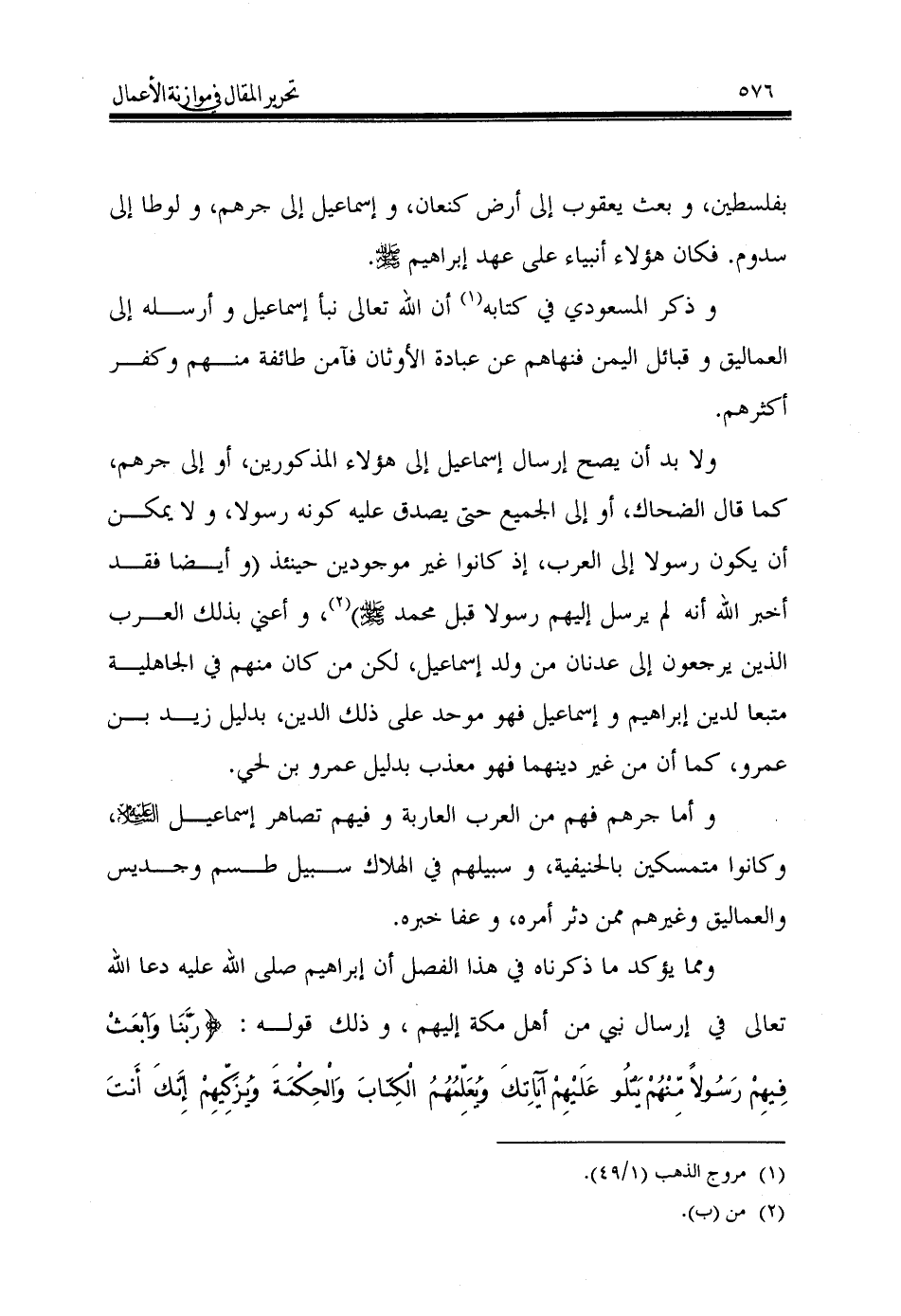 ولا بد أن يصح إرسال إسماعيل إلى هؤلاء المذكورين، أو إلى جرهم, كما قال الضحاك، أو إلى الجميع حتى يصدق عليه كونه رسولا، ولا يمكن أن يكون رسولا إلى العرب، إذ كانوا غير موجودين حينئذ (وأيضا فقد أخبر الله أنه لم يرسل إليهم رسولا قبل محمد - صَلَّى اللهُ عَلَيْهِ وَسَلَّمَ -) (¬2)، وأعني بذلك العرب الذين يرجعون إلى عدنان من ولد إسماعيل, لكن من كان منهم في الجاهلية متبعا لدين إبراهيم وإسماعيل فهو موحد على ذلك الدين, بدليل زيد بن عمرو, كما أن من غير دينهما فهو معذب بدليل عمرو بن لحي.