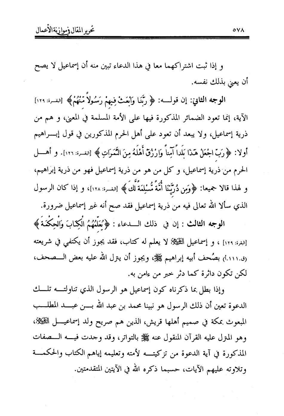 الوجه الثاني: إن قوله: {رَبَّنَا وَابْعَثْ فِيهِمْ رَسُولاً مِّنْهُمْ} [البقرة: 129] الآية، إنما تعود الضمائر المذكورة فيها على الأمة المسلمة في المعنى، وهم من ذرية إسماعيل، ولا يبعد أن تعود على أهل الحرم المذكورين في قول إبراهيم أولا: {رَبِّ اجْعَلْ هََذَا بَلَداً آمِناً وَارْزُقْ أَهْلَهُ مِنَ الثَّمَرَاتِ} [البقرة: 126]. وأهل الحرم من ذرية إسماعيل، وكل من هو من ذرية إسماعيل فهو من ذرية إبراهيم, ولهذا قالا جميعا: {وَمِن ذُرِّيَّتِنَا أُمَّةً مُّسْلِمَةً لَّكَ} [البقرة: 128] , وإذا كان الرسول الذي سألا الله تعالى فيه من ذرية إسماعيل فقد صح أنه غير إسماعيل ضرورة.