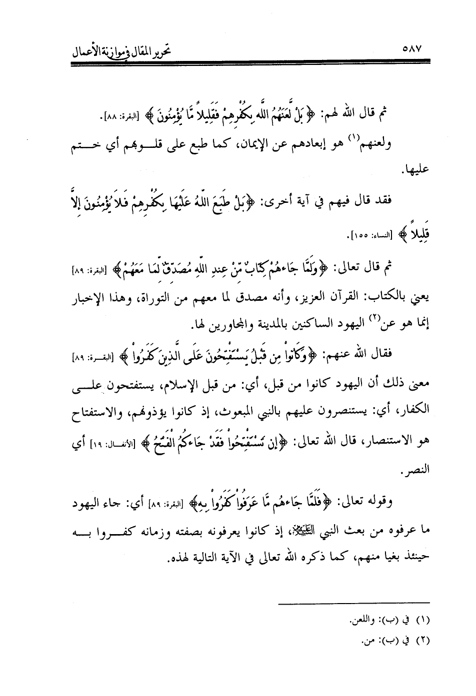 فقال الله عنهم: {وَكَانُوا مِن قَبْلُ يَسْتَفْتِحُونَ عَلَى الَّذِينَ كَفَرُوا} [البقرة: 89] معنى ذلك أن اليهود كانوا من قبل، أي: من قبل الإسلام، يستفتحون على الكفار، أي: يستنصرون عليهم بالنبي المبعوث, إذ كانوا يؤذونهم, والاستفتاح هو الاستنصار, قال الله تعالى: {إن تَسْتَفْتِحُوا فَقَدْ جَاءكُمُ الْفَتْحُ} [الأنفال: 19] أي النصر.
