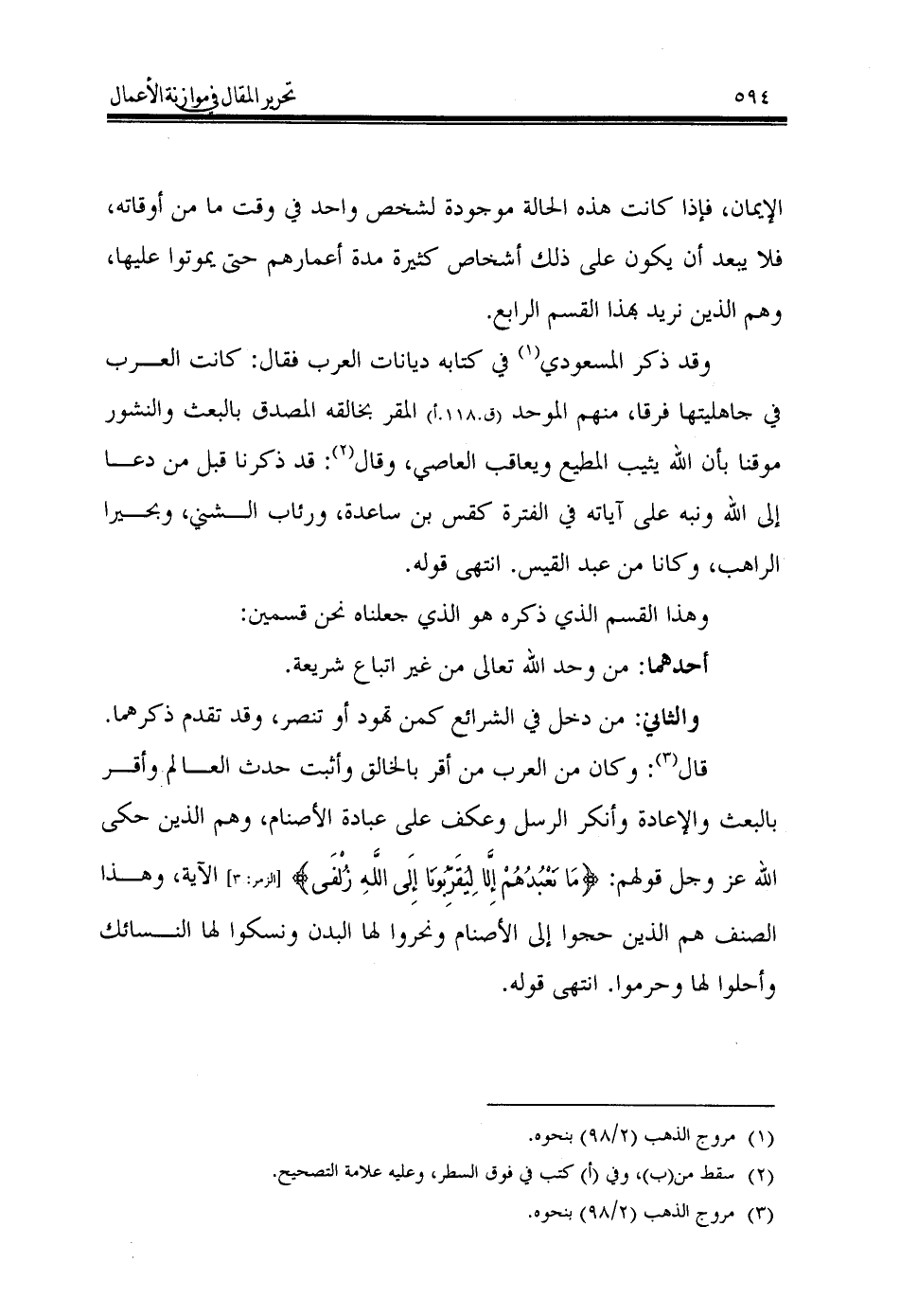 وقد ذكر المسعودي (¬1) في كتابه ديانات العرب فقال: كانت العرب في جاهليتها فرقا, منهم الموحد (ق.118.أ) المقر بخالقه المصدق بالبعث والنشور موقنا بأن الله يثيب المطيع ويعاقب العاصي, وقال (¬2): قد ذكرنا قبل من دعا إلى الله ونبه على آياته في الفترة كقس بن ساعدة, ورئاب الشني, وبحيرا الراهب, وكانا من عبد القيس. انتهى قوله.
