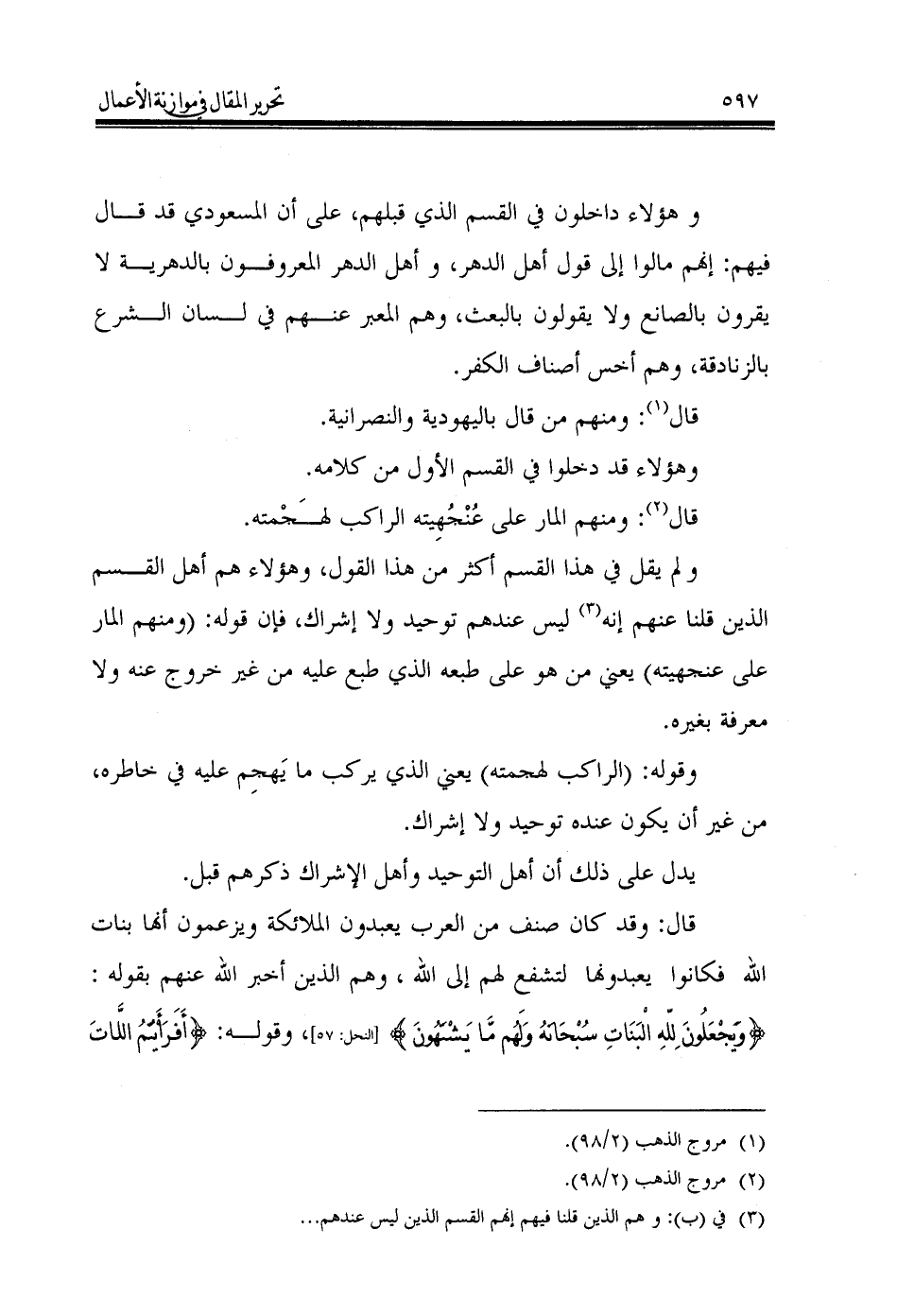وهؤلاء داخلون في القسم الذي قبلهم، على أن المسعودي قد قال فيهم: إنهم مالوا إلى قول أهل الدهر، وأهل الدهر المعروفون بالدهرية لا يقرون بالصانع ولا يقولون بالبعث, وهم المعبر عنهم في لسان الشرع بالزنادقة, وهم أخس أصناف الكفر.