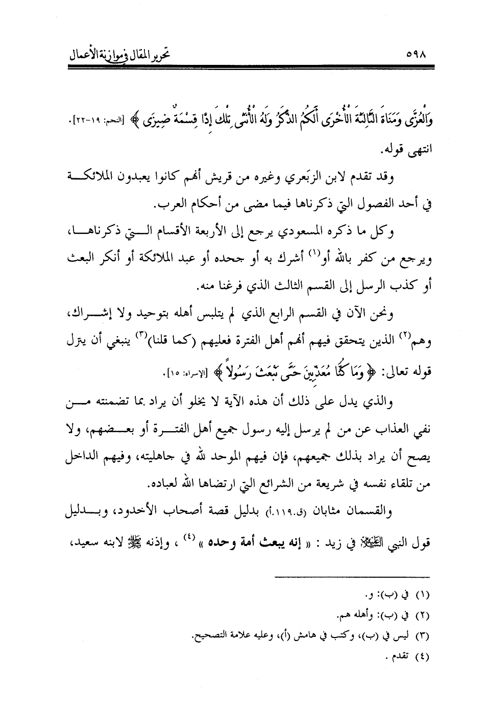 ونحن الآن في القسم الرابع الذي لم يتلبس أهله بتوحيد ولا إشراك, وهم (¬2) الذين يتحقق فيهم أنهم أهل الفترة فعليهم (كما قلنا) (¬3) ينبغي أن ينزل قوله تعالى: {وَمَا كُنَّا مُعَذِّبِينَ حَتَّى نَبْعَثَ رَسُولاً} [الإسراء: 15].