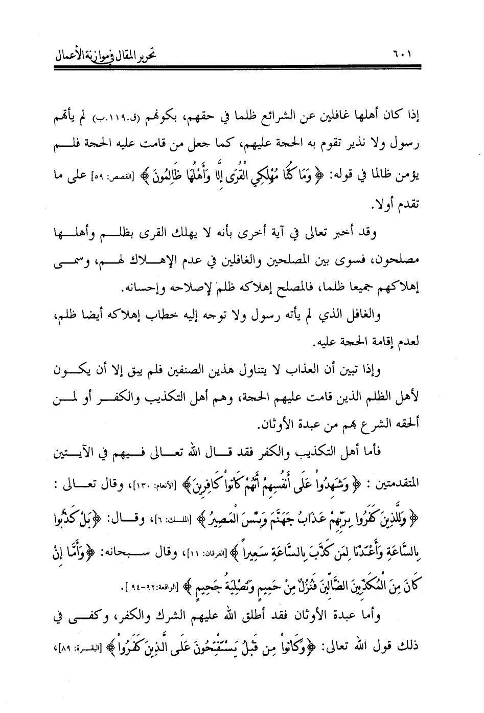 وإذا تبين أن العذاب لا يتناول هذين الصنفين فلم يبق إلا أن يكون لأهل الظلم الذين قامت عليهم الحجة, وهم أهل التكذيب والكفر أو لمن ألحقه الشرع بهم من عبدة الأوثان.