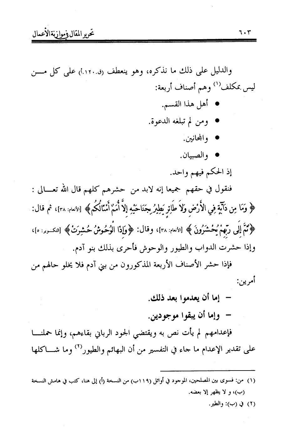 فنقول في حقهم جميعا إنه لابد من حشرهم كلهم قال الله تعالى: {وَمَا مِن دَآبَّةٍ فِي الأَرْضِ وَلاَ طَائِرٍ يَطِيرُ بِجَنَاحَيْهِ إِلاَّ أُمَمٌ أَمْثَالُكُم} [الأنعام: 38] , ثم قال: {ثُمَّ إِلَى رَبِّهِمْ يُحْشَرُونَ} [الأنعام: 38] , وقال: {وَإِذَا الْوُحُوشُ حُشِرَتْ} [التكوير: 5] , وإذا حشرت الدواب والطيور والوحوش فأحرى بذلك بنو آدم.
