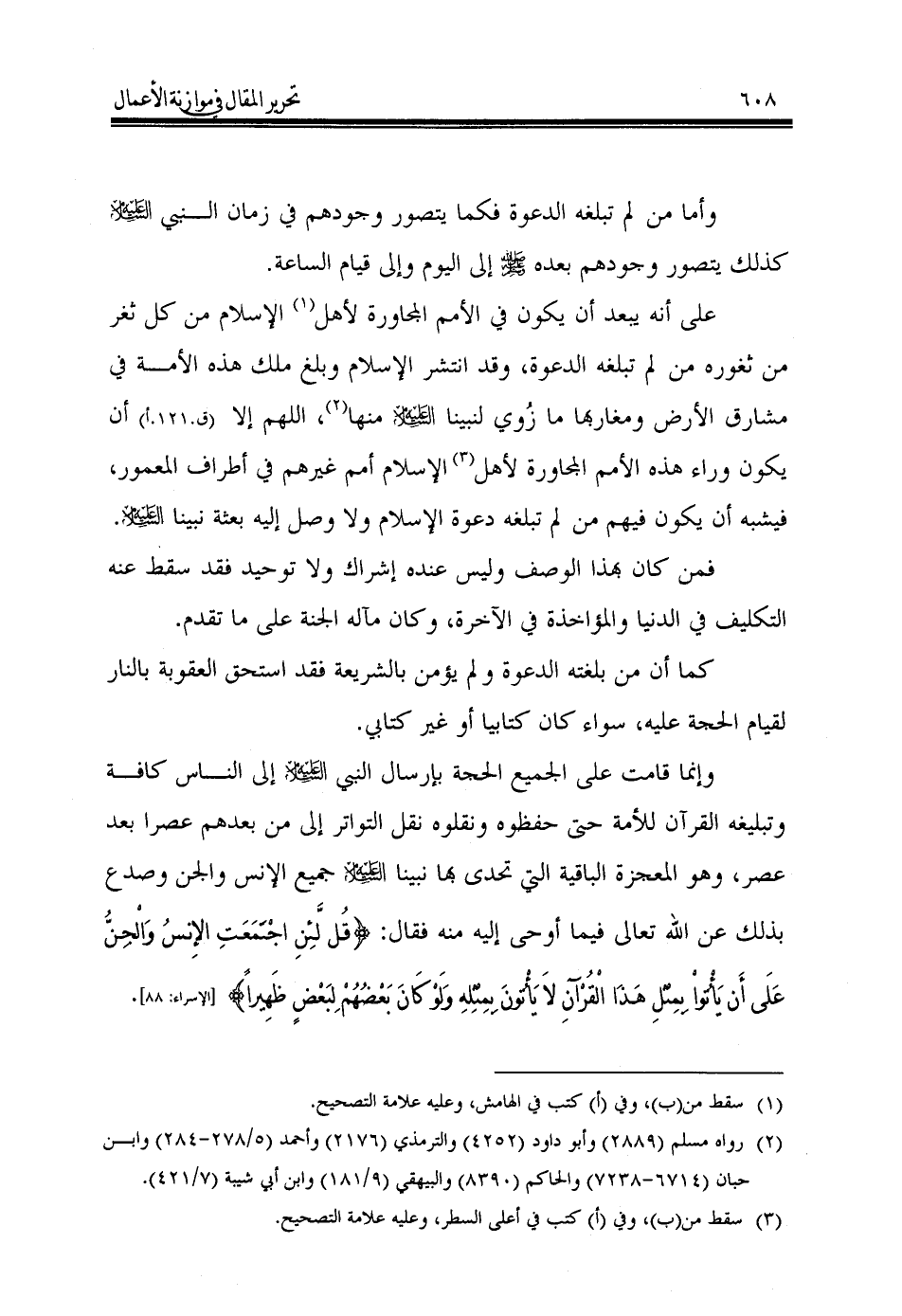 على أنه يبعد أن يكون في الأمم المجاورة لأهل (¬1) الإسلام من كل ثغر من ثغوره من لم تبلغه الدعوة، وقد انتشر الإسلام وبلغ ملك هذه الأمة في مشارق الأرض ومغاربها ما زُوي لنبينا - عليه السلام - منها (¬2)، اللهم إلا (ق.121.أ) أن يكون وراء هذه الأمم المجاورة لأهل (¬3) الإسلام أمم غيرهم في أطراف المعمور، فيشبه أن يكون فيهم من لم تبلغه دعوة الإسلام ولا وصل إليه بعثة نبينا - عليه السلام -.