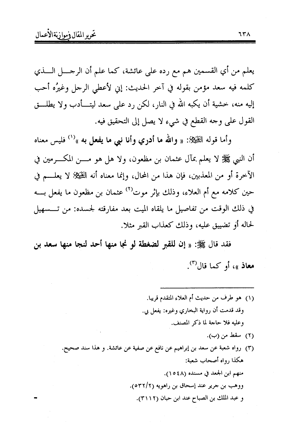 فليس معناه أن النبي - صَلَّى اللهُ عَلَيْهِ وَسَلَّمَ - لا يعلم بمآل عثمان بن مظعون، ولا هل هو من المكرمين في الآخرة أو من المعذبين، فإن هذا من المحال، وإنما معناه أنه - عليه السلام - لا يعلم في حين كلامه مع أم العلاء، وذلك بإثر موت (¬2) عثمان بن مظعون ما يفعل به في ذلك الوقت من تفاصيل ما يلقاه الميت بعد مفارقته لجسده: من تسهيل لحاله أو تضييق عليه، وذلك كعذاب القبر مثلا.