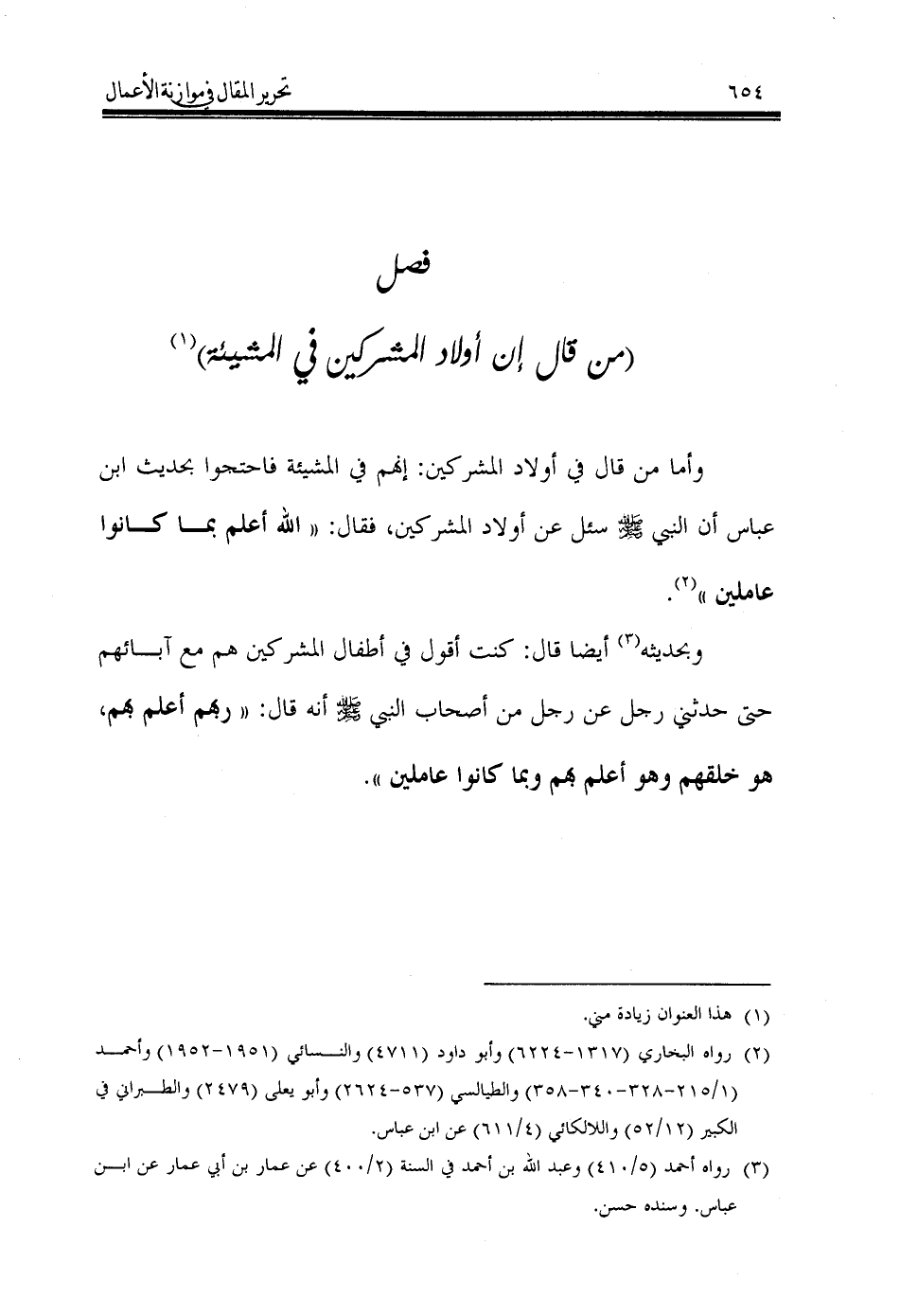 وأما من قال في أولاد المشركين: إنهم في المشيئة فاحتجوا بحديث ابن عباس أن النبي - صَلَّى اللهُ عَلَيْهِ وَسَلَّمَ - سئل عن أولاد المشركين، فقال: «الله أعلم بما كانوا عاملين» (¬2).