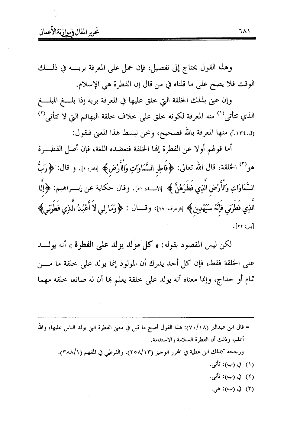 لكن ليس المقصود بقوله: «كل مولد يولد على الفطرة» أنه يولد على الخلقة فقط، فإن كل أحد يدرك أن المولود إنما يولد على خلقة ما من تمام أو خداج، وإنما معناه أنه يولد على خلقة يعلم بها أن له صانعا خلقه مهما