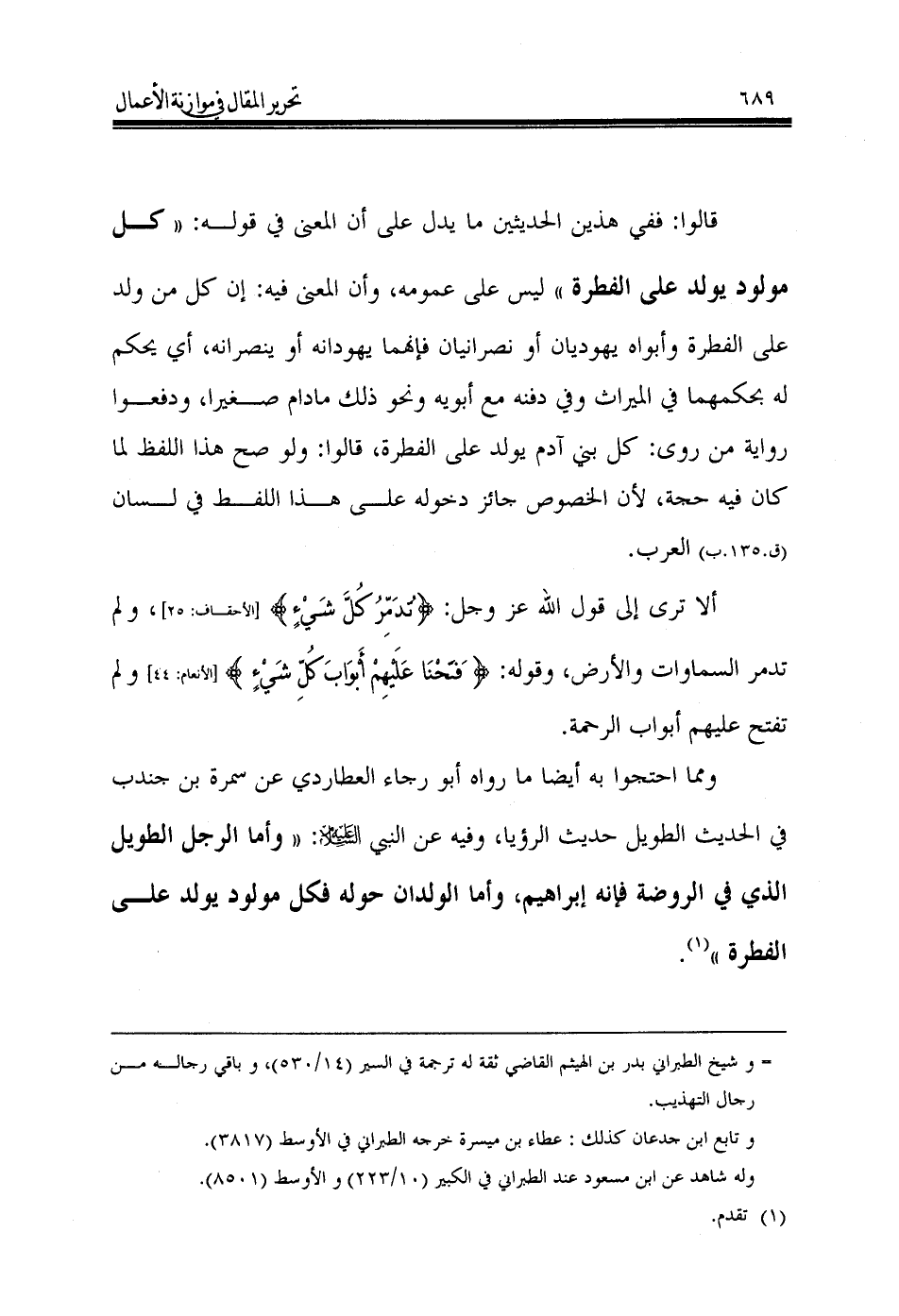 قالوا: ففي هذين الحديثين ما يدل على أن المعنى في قوله: «كل مولود يولد على الفطرة» ليس على عمومه، وأن المعنى فيه: إن كل من ولد على الفطرة وأبواه يهوديان أو نصرانيان فإنهما يهودانه أو ينصرانه، أي يحكم له بحكمهما في الميراث وفي دفنه مع أبويه ونحو ذلك مادام صغيرا، ودفعوا رواية من روى: كل بني آدم يولد على الفطرة، قالوا: ولو صح هذا اللفظ لما كان فيه حجة، لأن الخصوص جائز دخوله على هذا اللفط في لسان (ق.135.ب) العرب.