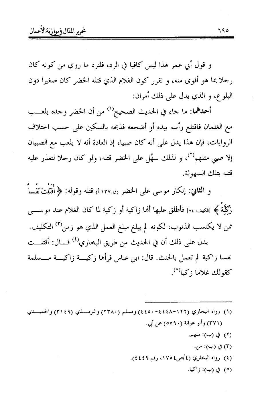وقول أبي عمر هذا ليس كافيا في الرد, فلنرد ما روي من كونه كان رجلا بما هو أقوى منه، ونقرر كون الغلام الذي قتله الخضر كان صغيرا دون البلوغ، والذي يدل على ذلك أمران: