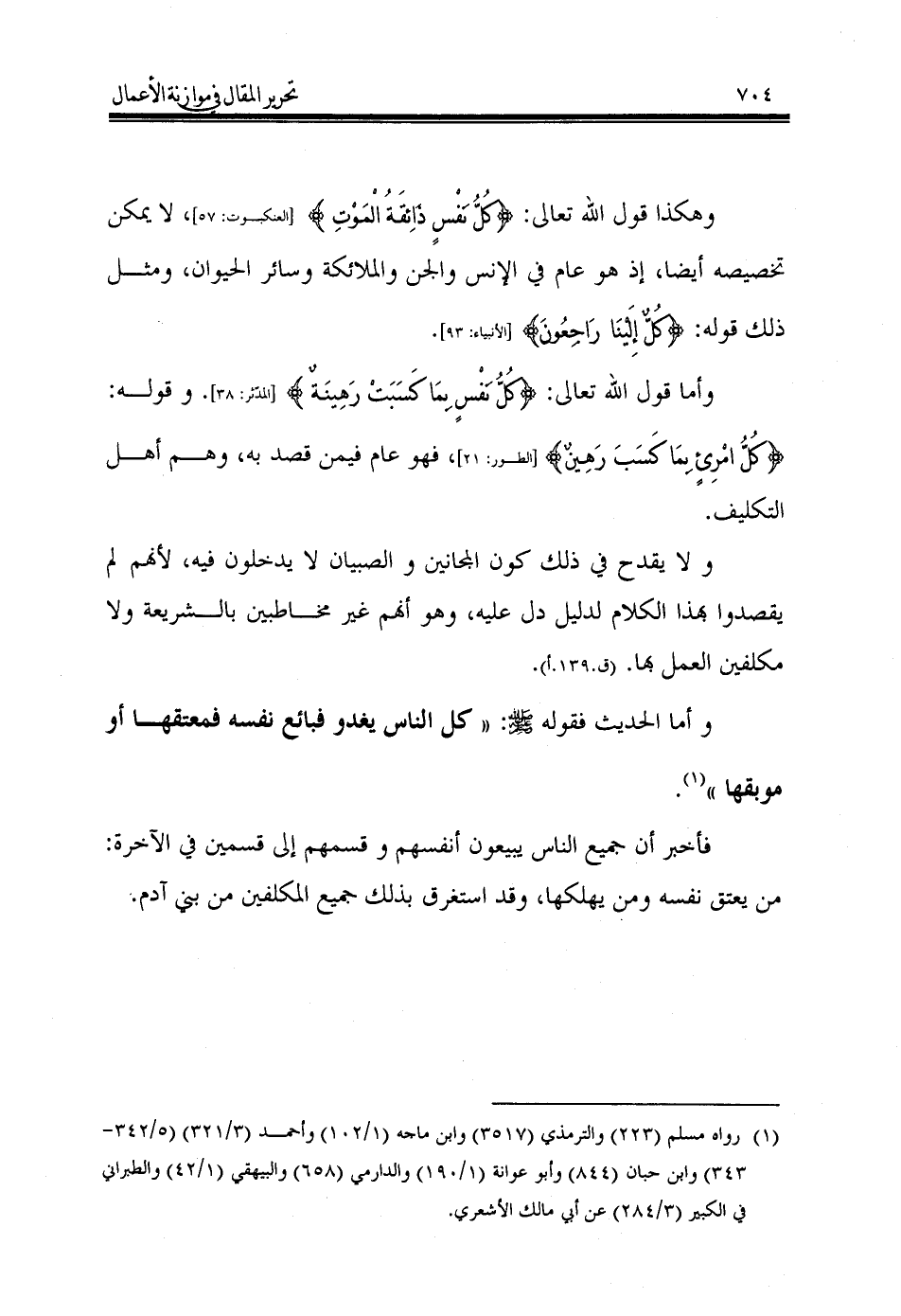 وأما الحديث فقوله - صَلَّى اللهُ عَلَيْهِ وَسَلَّمَ -: «كل الناس يغدو فبائع نفسه فمعتقها أو موبقها» (¬1).