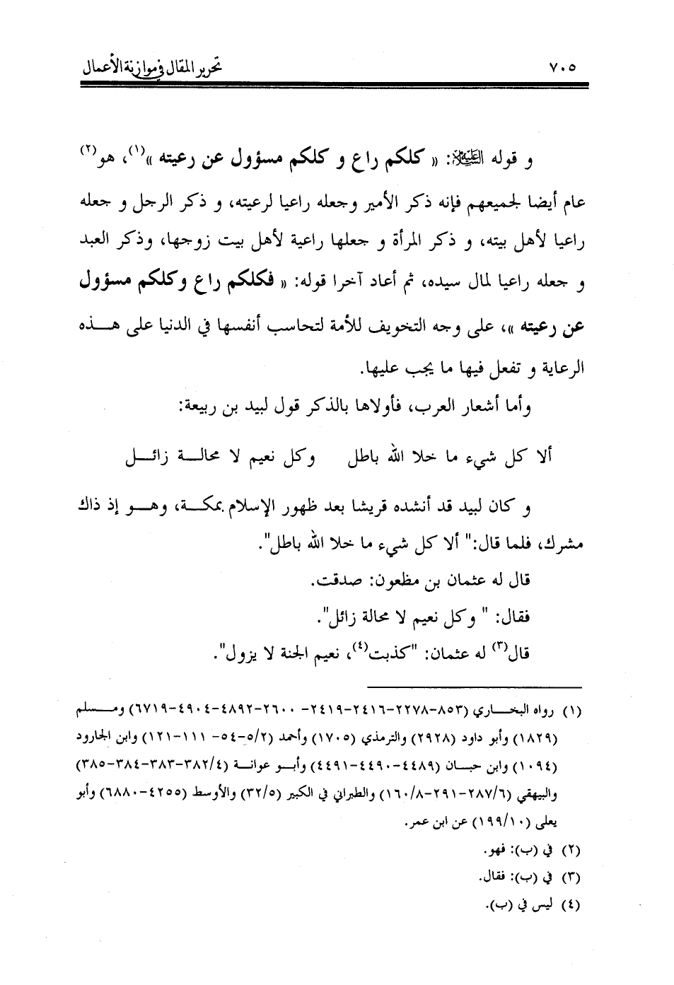 وقوله - عليه السلام -: «كلكم راع وكلكم مسؤول عن رعيته» (¬1)، هو (¬2) عام أيضا لجميعهم فإنه ذكر الأمير وجعله راعيا لرعيته، وذكر الرجل وجعله راعيا لأهل بيته، وذكر المرأة وجعلها راعية لأهل بيت زوجها، وذكر العبد وجعله راعيا لمال سيده، ثم أعاد آخرا قوله: «فكلكم راع وكلكم مسؤول عن رعيته»، على وجه التخويف للأمة لتحاسب أنفسها في الدنيا على هذه الرعاية وتفعل فيها ما يجب عليها.