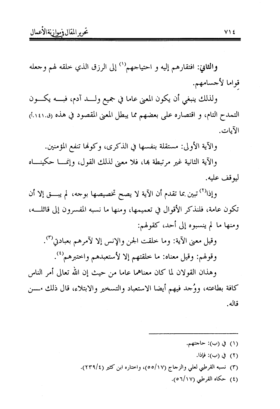 ولذلك ينبغي أن يكون المعنى عاما في جميع ولد آدم، فبه يكون التمدح التام, واقتصاره على بعضهم مما يبطل المعنى المقصود في هذه (ق.141.أ) الآيات.